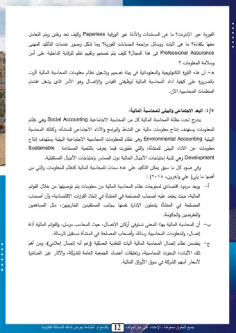 جميع الحقوق محفوظة ـ اإلعتداء على حق المؤلف 12 بالنسخ أو الطباعة يعرض فاعله للمسائلة القانونية8محم يمل ل ل مةكا كت؟ل يبل ىل محايال ملل ةم حمل غن ل مح نمللPaperless ةلن ل تت ل ةتقليل ةيا ل محاتبيلليت بل تصمب و؟ل يبل ىل آحنبلل ةةةب لل ي م تمل محسيبتبلل محم يم؟ل ةيبل لصلل ةث ل د يبلل محاأتن ل محا لىلAssurance Professional دىل لمل محا با؟ل لن ل ا ل ت ان ل ةتقنن ل كم ل ح بتمل مح مد نمل ىل أييلةة يملمحات يبلل؟ه- أنل لهل محث ول محاملل ح نمل ةمحات يبتنمل دىل ينكمل ت ان ل ةتن نلل كمبال يت يبلل محاسبةلمل محابحنمل أث للتبحض ة ول ىل لنمنمل آ م ل محاسبةلمل محابحنمل ح انماىل محقنبجل ةمةت بال ة ل م ي ل محلقل ن لل م اابالمحالمابللمحاسبةلنملمآلن.ل5/4 :البعد االجتماعى والبيئى ل محا بة المالية: ل ولتستليم ملمحاسبةلملمحابحنمللللييلمحاسبةلملم ااب نملAccounting Social ة ىلكمبالح ات يبلل يا لإكابوليت يبلليبحنمل يلمحلنبطلةمحل ميجلةمآل م لم ااب ىلح النأوىلةللحللمحاسبةلملمحلنكنملAccounting Environmental ة ىلكمبالح ات يبللمحاسبةلنملم ااب نملمحلنكنمل يا لإكابوليت يبلل يل مآل م ل محلنكىل ح النأوىل ةمحا ل تت لل دنابل ت ل تبحالانمل محايا ميملل SustainableDevelopment ة ت لنم إ انب بل م نبا محسبحنم ةن محايبج تإ انب بل م نبا محاياقل نم.ةدىلا لللليبلةل ل اصيلمحاأتن ل ىل ولةابللح اسبةلملمحابحنم للمبالح ات يبللةمحاىلييلأ ا بليبل ى) ةآد ةنى 2018: )أ- لي ة لم ا ب ملحاد بللكمبالمحاسبةلملمحابحنملييليت يبلل ا لت ثن بلييلد المحق م لمحابحنمى نتل تاا ل نهلأثسببلمحا سملد لمحالنأو د لإتدبال محق م مللم ا ب مى ةلأنلأثسببلمحا سمل د للمحالنأو نا ن مة م و كمي بل ت بك ل محايامن يل محدب ننيىل يثلل محايب انيلةمحاق انيلةمحسص يم.بل- أنلمحاسبةلملمحابحنملي لملمحاتلىلتيا دىلأ لبنلمةت باىل نتلمحاسبة لي ةلى ةمحق لم لمحابحنملأ مولإت باى ةمحات يبللمحاسبةلنمل ةبحمى ةأثسببلمحا سملد لمحالنأو يياقلللح لةبحم.و- اضايللكمباللإت بال محاسبةلمل محابحنمل آحنبلل ح ا ل مل محتيصنملل) غ للأكهللإت بال إ ي (ى ةييللأل لت لل مآلحنبلل؛ محلس ل محاسبةلنمىللةلتت نقبلل أ ضب ل مح اتنمل محتبيمل ح ن لمىل ةمآلثب ل غن ل محالبل ول ةتب أة محن لم د ة ، م ة م ، محابحنم.