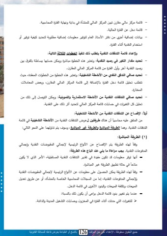 جميع الحقوق محفوظة ـ اإلعتداء على حق المؤلف 126 بالنسخ أو الطباعة يعرض فاعله للمسائلة القانونية122- ب ام ي ل يبح يقب ن تلني محا ل محابح ح النأو د ي م م ةك ب م محما و محاسبةلنم.- ب امل دلل يلمحما ولمحسبحنم.- ينبكبل إابدنم أد م يي دا م ةابال محتبا حا دن يت يبلل إابدنم يت م حاس ل تنمنم ت دن لأةلمةاد ما محلق م أثلب محما و.وإلعداد قائمة التدفقات النقدية يتط ب ذلك تنفيذ الرطوات الثالثة التالية:- تحديد مقدار التغير في رصيد النقدية: ةتتال له محدت و يلبل ولةياصي يبي ب يليب م تبحم ، يني ثن ل محلق م آد ةأةالمحما و يي ب ام محا ل محابح محاقب ن. - تحديد صافي التدفق النقدي م األنشطة التشغي ية: ةتتال له محدت و يي محدت مللمحاتق وى نتلتات ل تس نل ب ام دل محما و تبةابدم إحى ب ام محا ل محابح محاقب نى ة تض محاتبي للمحاداب و.- تحديد صافي التدفقات النقدية م األنشطة اال تثمارية والتموي ية: ةياصي محا ثل إحىل احل ييتس نل تل محا ن ملل د يبتبلل ب ام محا ل محابح حاس ل أث احل ى محلق م. اإلف اح ع التدفقات النقدية م األنشطة التشغي ية: :أوالن أنل لب ل ريقتي ل ،لمحا دقبللمحلق ملييلاأل نشطة التشغي ية د ل ب امل ييلمحاام ل نهل يسبةلنبمحا دقبللمحلق م. ة ابلالطريقة المباشرخ والطريقة غير المباشرخىلةة ل ا لتلبةح ابل ىلمحلس لمحابح :)1 )الطريقة المباشرخ:ةدقب مةد ب لل يل م ك م ل مح نينمل ة ابح ل محاقل ابلل محلق مل ةإ ابح ل ن ح له محت يقم ا محا د بللمحلق م.ليجب مراعاخ ما ي ي عند اتباع هذ الطريقة:− أك ب ت د يت يبل تم ن يمن و د تق محا دقبل محلق م محاياقل نمى م ي محلم ص نن د بحم تتلن محت يقم غن محالبل و.ياب بن ح له محت يقمل اصيلمحس ال ىليت يبلل يلم ك م لمح نينملة ابح لمحاقل ابللمحلق مل− ةدقبةة ابح لمحا د بللمحلق مىلإيبلييلمحي للمحاسبةلنملمحدبثملتبحالنأوى أةل يل ي لتت للمحالنتبل ةتم مم محالنتبل ةمحلل م د ق د ب ام مح دل.− ل يبل ا لت نن ليل ل ب املمح دلل م ى أن ص ن احل تبحليلم:➢ ح ا ن م ل محا ثت أثلب محما و د محاد ةن ة يبتبل محان نل محا لم ةمح م لم.