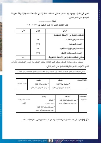 جميع الحقوق محفوظة ـ اإلعتداء على حق المؤلف 128 بالنسخ أو الطباعة يعرض فاعله للمسائلة القانونية124نقص في نقدية، ومنها يتم حساب صافي التدفقات النقدية م األنشطة التشغي ية وفقا يقة ل طرالمباشرخ ع ى النحو التالي: شركة .................... قائمة التدفقات النقدية ع السنة المنتهية في 31/12 /2020البيا جيئي ك يالتدفقات النقدية م األنشطة التشغي ية. + المح ل م العمالء - المسدد ل موردي + المح ل م اإليرادات األخرى- المسدد ل م روفات األخرىصافي التدفقات النقدية م األنشطة التشغي ية. ×× )××(×× )××(×× ةياصيل ،ل يتب حمل تس يلل يتم ل محقن ل محمب ول تقب امل مح دلل ييل أةبجل م ةاسقب،ل حألةبجلمحلق مل غ م،لتتلن لمحت يقملمحالبل ول ىلمحلس لمحابح :ثبد لمحالنتبلل يلمحما ول+ل ثن لمحتا لأةالمحما ول– ثن لمحتا لك ب ملمحما ول=لمحاس للييلمحتا تم مملمحالنتبل يضاف * يد ةن ك ب م محما و * ثن لمحا يلأةالمحما وير م * يد ةن ي م م محما و* ثن لمحا يلآد لمحما ومحاي لح ا يلمحا ةدبللمحان ن نميضاف * ي ةدبلليق يم ك ب ملمحما و *لي ةدبلليياسقم أةالمحما ولير م * مة ل* ن يت ةيم.* ي ةدبلليق يملأةالمحما ول*لي ةدبلليياسقملآد لمحما و.لمحاي لح ا ةدبللم د قمثال )1 :)دنابل ل ب املمح دللحن لملم ك حينم يلمحيلملمحالا نملد ل31/12/2020: