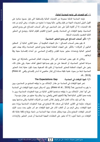 جميع الحقوق محفوظة ـ اإلعتداء على حق المؤلف 13 بالنسخ أو الطباعة يعرض فاعله للمسائلة القانونية96 -أهم التحديات التى تواجه المحا بة المالية: ت م هل محاسبةلمل محابحنمل ي ا مل ييل محاس بلل محسبحنمل ةمحاياقل نمل محاىل تمث ل ت ول يلبل ول ىلمحقل المح ةحىلحاد بللمحا لملييل م لةتقب ي ليبحنملة وليبلتسا يهلييليت يبل.لة ىلمح غ لييلتت لت ل محاس بلى إ أن أتث ب تأثن م محاسبةلنيل ؛لتأثن لأثسببلمحا بححل ىلةاةلمحاتب ن ل ن ى المحاسبةلنمىل ةد ول محا تبلل د ل محاسبةلمىل ة ل محلا اول محاق ن قل ح ق م ل محابحنم.للةك احل د ل محيت لمحابحنملمحاق ل تبحاس بللمحيبتقم.ل6/1 :تأثير أصحاب الم الح ع ى وضع المعايير المحا بية: ل ق التتضلأثسببلمحا بححل- يثللمح بللمحسص ينملأةلليت ةم محاقب ي لمحابحنملأةللمحاس نيلمحابحننيللأةللمحن لبلل- تبحاأثن ل ىل مح بلل محالمامل حتا نمل ةاةل محاتب ن ل محاسبةلمىل ةاحلل ي ل ت نن لن محاتب ن ل محسبحنمل ةإةاس م ل يتب ن ل ول ح قنبجل ةلمةد ب محاسبةل ل يل أ م للإ ا ب م يتنلم ةدقبح غلبت .لة بحابحىل ل تق ال تتضل مح اب بلل محاىل تاأث ل تاد بلل محلمبال محاسبةل ل تبحانب لمل د ل ا نملثنبغمل محاتب ن ل محاسبةلنمىللأةللمحض طل ىل ييل ق ال ت نبغا بل حاسقن ل أ م ل يتنلم.ل ةد ل يقبيلل احلىل اتنيل ىل مح بلل محالمامل ح اتب ن ل محاسبةلنمل أنل تقبةا ت ل محض ط تسنت تم ن ا نم إ م محاتب ن محاسبةلنملكبتتملييلتس ل انمل نقملييال ولإحىلإ ب ليمب نا حهلأةبجلإ ا ب ملةم ت ل et Kieso((2018., al.ل6/2 :فجوخ التوقعات في المحا بة: Gap Expectations Theتتل لد ولمحا تبللد لمحاسبةلمل يليق م لمةدا لينيليبل ا تهلمحا ااةلييلمحاسبةلنيىلة نيلن (2018., al et Kieso .(ةك ق أكه اصي تت يف د ولمحا تبللد لمحاسبةلمليب ق ا ته محاسبةل ن دت ىلأك ب \يق م لمةدا لينيليبل ا تهليياد ي ملمحاقب ي لمحابحنملييل ولمحات يبللمحاسبةلنمىلة نيليبلن ةدقب ى ةيبل سص لينكمل ا لييل ميلليمةينم\.ل ن حاأ ن محت ا ةمحتا ق يه يت ةم محاقب ي محابحنم دت ة لأ قلت م ل ب للمحمنللمحابحىلةإل ب لإد جلمحت لييلمحن لبللمحتبحانمىلةمحاىلثب ل بلة لتس يمبلل يا م ول د ل محاقب ي ل محابحنمل إحىل ات ل ثقمل محا ااةل د ل ول محات يبلل محاسبةلنمللةزيب ول ل د و محا تبل. ة ى مح غ يي أن محا محابا ى د و محا تبل أي كم ق تستل تيل ل محا م لمحاياا لحا تبللمحا ااةل تنأنل ول ةكتب،لد يبللي لملمحاسبةلملييل كب نمىلةإ تمب لتم ممليقبي ملت للمحا تبل يي كب نم أد قى إ أكه اتني ى محالمابل محا لنم محاسبةلنم أن ت محاتب ن ةمة لب مل