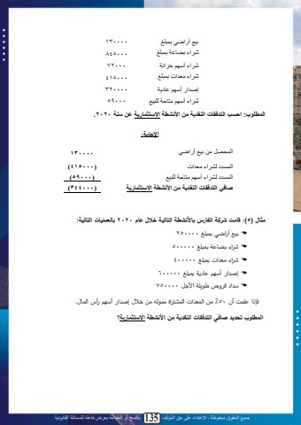 جميع الحقوق محفوظة ـ اإلعتداء على حق المؤلف 135 بالنسخ أو الطباعة يعرض فاعله للمسائلة القانونية131بيع أراضي بمبلغ 130000شراء بضاعة بمبلغ 845000شراء أسهم خزانة 72000شراء معدات بمبلغ 415000إصدار أسهم عادية 320000شراء أسهم متاحة للبيع 59000المطلوب: احسب التدفقات النقدية من األنشطة االستثمارية عن سنة 2020 .اإلجابة:130000 المحصل من بيع أراضي المسدد لشراء معدات )415000 )المسدد لشراء أسهم متاحة للبيع )59000 )صافي التدفقات النقدية من األنشطة االستثمارية )344000 )مثال )5 :)قامت شركة الفارس باألنشطة التالية خالل عام 2020 بالعم يات التالية: ينةلأ ما لتال غل250000 ل م لتضب ملتال غل500000 ل م ليت مللتال غل400000 إث م لأة ل ب ملتال غل600000 ة م ل ة،ل ي ملم لل750000 دإامل اتلأنل50 %ييلمحات مللمحانا موليا حهلييلد الإث م لأة أجلمحابا.المط وب تحديد صافي التدفقات النقدية م األنشطة اال تثمارية؟