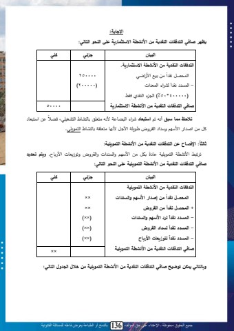 جميع الحقوق محفوظة ـ اإلعتداء على حق المؤلف 136 بالنسخ أو الطباعة يعرض فاعله للمسائلة القانونية132اإلجابة:يظهر صافي التدفقات النقدية م األنشطة اال تثمارية ع ى النحو التالي:البيا جيئي ك يالتدفقات النقدية م األنشطة اال تثمارية. ن يي ينة م م ا محاس ل كق من حن م محات مل- محاي كق م )400000*50)%لمح لمحلق ملدقطصافي التدفقات النقدية م األنشطة اال تثمارية 250000)200000)50000ن ي مةالتب نالحظ مما بق أكهلت لا تبعاد ل م محلضب م كه يات تبحلنبط محان ن ى دض تللييلمث م لم ة لةة م لمحق ة،ل ي ملمآل لل ك بليات قملتبحلنبطلمحاا ي .ثالثا اإلف اح ع التدفقات النقدية م األنشطة التموي ية: ُ:ت تلط م كنتم محاا ي نم ب و تصلل ييل م ة ل ةمحيل ملل ةمحق ة، ةت زيتبلل م ب . و يتم تحديد ن صافي التدفقات النقدية م األنشطة التموي ية ع ى النحو التالي:البيا جيئي ك يالتدفقات النقدية م األنشطة التموي ية م إصدار األ هم والسندات المح ل نقدا م القروض+ المح ل نقدا لرد األ هم والسندات- المسدد نقدا لسداد القروض- المسدد نقدا لتوزيعات األرباح- المسدد نقداصافي التدفقات النقدية م األنشطة التموي ية ×× ×× )××(ل)××(ل)××(ل×× وبالتالي يمك توضيح صافي التدفقات النقدية م األنشطة التموي ية م خالل الجدول التالي: