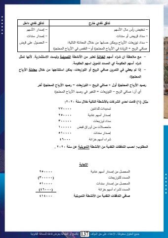 جميع الحقوق محفوظة ـ اإلعتداء على حق المؤلف 137 بالنسخ أو الطباعة يعرض فاعله للمسائلة القانونية133تدفق نقدي خارج تدفق نقدي داخل - تدمنضل أجليبالم ة ل- ة م ل ة،لأةلةل مل- ة م لت زيتبللم ب ةياصيل يبي بلييلد المحاتب حملمحابحنم:لثبد لمح حل+لمح يب ولد لم ب لمحاسا ولأة– محلقصلد لم ب لمحاسا ول- إث م لم ة ل- إث م لةل ملل- محس ال ىل ،ل- مع مالحظة ا شراء أ هم الريانة تعتبر م األنشطة التموي ية وليست اال تثمارية. ألنها تمثل شراء أ هم الحكومة اي المسدد لتمويل ا هم الحكومة. - إذا لم يعطي في التمري صافي الربح أو التوزيعات، يمك ا تنتاجها م خالل معادلة األرباح المحتجيخ:رصيد األرباح المحتجيخ أول + صافي الربح – التوزيعات = رصيد األرباح المحتجيخ أخرأملأن:لثبد لمح حل– محا زيتبلل=لمحا ن لد ل ثن لم ب لمحاسا ولمثال )6 )قامت احدي الشركات باألنشطة التالية خالل سنة 2020 :تسديدات للدائنين 770000إصدار أسهم عادية 250000سداد توزيعات 300000متحصالت من أوراق قبض 100000إصدار سندات 510000شراء أسهم خزانة 46000المطلوب: احسب التدفقات النقدية من األنشطة التمويلية عن سنة 2020 . اإلجابةالمحصل من إصدار أسهم عادية 250000المسدد للتوزيعات )300000 )المحصل من إصدار سندات 510000المسدد لشراء أسهم خزانة )46000 )صافي التدفقات النقدية من األنشطة التمويلية 414000