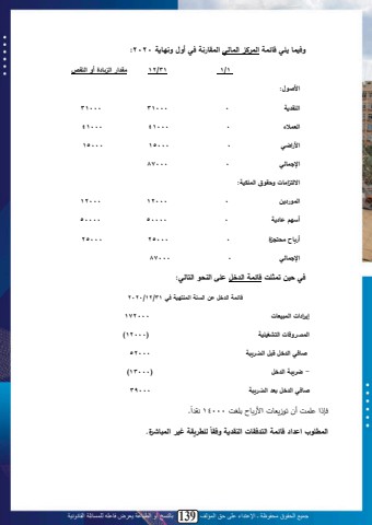 جميع الحقوق محفوظة ـ اإلعتداء على حق المؤلف 139 بالنسخ أو الطباعة يعرض فاعله للمسائلة القانونية135وفيما ي ي قائمة المركي المالي المقارنة في أول ونهاي ة 2020 : 1/1 31/12 مقدار الييادخ أو النقصاألصول:النقدية 0 31000 31000العمالء 0 41000 41000األراضي 0 15000 15000اإلجمالي 0 87000االلتيامات وحقوق الم كية:الموردي 0 12000 12000أ هم عادية 0 50000 50000أرباح محتجيخ 0 25000 25000اإلجمالي 0 87000 في حي تمث ت قائمة الدخل ع ى النحو التالي:قائمة الدخل ع السنة المنتهية في 31/12/2020إيرادات المبيعات 172000الم روفات التشغي ية )12000)صافي الدخل قبل الضريبة 52000- ضريبة الدخل )13000)صافي الدخل بعد الضريبة 39000ن دإامل اتلأنلت زيتبللم ب لي تل14000. كق م المط وب اعداد قائمة التدفقات النقدية ل طريقة غير المباشرخ.وفقا