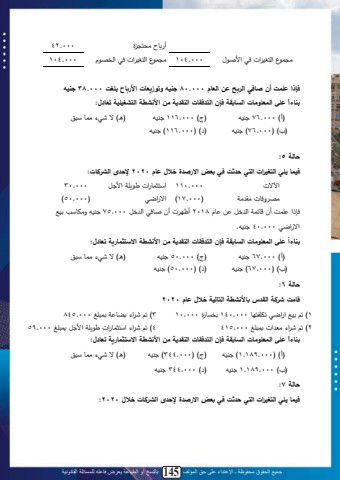 جميع الحقوق محفوظة ـ اإلعتداء على حق المؤلف 145 بالنسخ أو الطباعة يعرض فاعله للمسائلة القانونية141أ ب ليسا ول 000.42ي ا لمحا ن مللد لم ث ال 000.104 ي ا لمحا ن مللد لمحد ال 000.104فإذا ع مت أ صافي الربح ع العام 000.80 جنيه وتوزيعات األرباح ب غت 000.38 جنيه ع ى المع ومات السابقة فإ التدفقات النقدية م األنشطة التشغي ية تعادل:بناءا)أ(ل000.76 لنهل )و(ل000.116 لنهل ) و(ل لل ليابلةل ل)ب(ل)000.76)ل لنهل ) (ل)000.116)ل لنهلحالة 5:فيما ي ي التغيرات التي حدثت في بعض االرصدخ خالل عام 2020 إلحدى الشركات:مآل للل 000.110 مةاثاب ملل ي ملم لللل 000.30ي ةدبلليق يمل )000.17 )م ما ل )000.50)دإامل اتلأنل ب املمح دلل يل بال2018 أا للأنلثبد لمح دلل000.75 لنهلةيصبة لينةلم ما ل000.40 لنه.لبناءا التدفقات النقدية م األنشطة اال تثمارية تعادل: ع ى المع ومات السابقة فإ )أ(ل000.67 لنهل )و(ل000.50 لنهل ) و(ل لل ليابلةل ل)ب(ل)000.67)ل لنهل ) (ل)000.50)ل لنهلحالة 6 :قامت شركة القدس باألنشطة التالية خالل عام 20201)لت لينةلم ما لتم ما بل000.140 تديب ول000.10 3)لت لل م لتضب ملتال غل000.8452)لت لل م ليت مللتال غل000.415 4)لت لل م لمةاثاب ملل ي ملم للتال غل000.59 ع ى المع ومات السابقة فإ التدفقات النقدية م األنشطة اال تثمارية تعادل:بناءا)أ(ل)000.189.1)ل لنهل )و(ل)000.344)ل لنهل ) و(ل لل ليابلةل ل)ب(ل000.189.1 لنهل ) (ل000.344 لنهلحالة 7:فيما ي ي التغيرات التي حدثت في بعض االرصدخ إلحدى الشركات خالل 2020 :