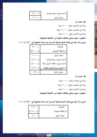 جميع الحقوق محفوظة ـ اإلعتداء على حق المؤلف 151 بالنسخ أو الطباعة يعرض فاعله للمسائلة القانونية147)-(لي ب يفلينتنهلةإ م يم )60000)لللللثبد لمح حل 300000فإذا ع مت أ : زيب ولد لمحا لنيلتال غل40000 لنملزيب و د محاد ةن تال غ 120000 لنملزيب و د مح م ل ن تال غ 80000 لنملالمط وب: تحديد صافي التدفقات النقدية م األنشطة التشغي ية . تمري )5 :)فيما ي ي قائمة الدخل ل شركة الم رية ع السنة المنتهية في 31 /12/2020:للللمحالنتبلل)-(لتم مملمحالنتبلل420000)320000)للللي اللمح ح)-(لي ب يفلينتنهلةإ م يم)-(لي ة لإ لأث الثبيامل)-(لديب لينةلم ث المحثبيامل100000)15000)ل)10000)ل)12500)لللللثبد لمح دل 62500فإذا ع مت أ : زيب ولد لمحتا لتال غل10000 لنملزيب و د محاد ةن تال غ 30000 لنملزيب و د مح م ل ن تال غ 20000 لنملالمط وب: تحديد صافي التدفقات النقدية م األنشطة التشغي ية. تمري )6 :)فيما ي ي قائمة الدخل ل شركة الم رية ع السنة المنتهية في 31 /12/2020:للللمحالنتبلل)-(لتم مملمحالنتبلل168000)128000)للللي اللمح ح 40000