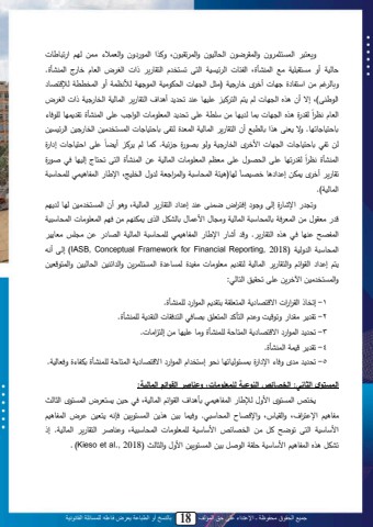 جميع الحقوق محفوظة ـ اإلعتداء على حق المؤلف 18 بالنسخ أو الطباعة يعرض فاعله للمسائلة القانونية14ةيتال محاياثا ةن ةمحاق ا ن محسبحن ن ةمحا تقل نى ةللم محا ةن ةمحتا ياي ح م تلب بل بحنمللأةللييالقل نمل يةللمحالنأوىل محمكبلل مح نينمل محاىل تياد ال محاقب ي ل املل مح ،ل محتبال دب وللمحالنأو. ة بح غ يي مةامب و بل أد ق دب نم )يثل مح بل محسص ينم محا م حألكمام أة محادتتملحإل ا ب لمح لى(ىلإ لأنل لهلمح بللح ل ا لمحا لن ل ن بل ل لتس لأ م لمحاقب ي لمحابحنملمحدب نملامللمح ،لمحتبا كم م بلييلة تمل ىلتس لمحات يبللمح م ل ىلمحالنأول تق ا بلح دب ل ن حق و له مح بل تاب ح تب انب بت ب.لة ل تلىل لملتبحتلةلأنلمحاقب ي لمحابحنملمحات ولحامىلتب انب بللمحاياد ينيلمحدب نيلمح نينيلحي تم تب انب بل مح بل م د ق محدب نم ةح ت و نم. لاب ح ل أ ضب إ م ول ن ى م انب بلكم م محالنأو محاىل تسابول إحن بل د ل ث ول ن محالنأو حق ت ب ى محس ا ى يتم محات يبل محابحنم يتقب ي أد ق اصي إ م ب د ن ب ) نكم محاسبةلمل ةمحا م تم ح ةا محد نجى مة ب محامب نا ح اسبةلمل ن ح بمحابحنم(.ةت لمةلب ولإحىلة لإدا م،لاالىل ل لإ م لمحاقب ي لمحابحنمىلة لأنلمحاياد ينيلح بلح ل ليتق الييلمحات دملتبحاسبةلملمحابحنملةي بالم ابالتبحنصللمحلقل اصل لييلد لمحات يبللمحاسبةلنملمحام حل ل بل د ل لهل محاقب ي . ة ل ألب ل مة ب ل محامب نا ل ح اسبةلمل محابحنمل مح ب يل ي ال يتب ن لمحاسبةلمل مح ةحنم (2018, Reporting Financial for Framework Conceptual, IASB (إحىل أكهل ا ل إ م للمحق م ل ةلمحاقب ي ل محابحنمل حاق ل يت يبلل يمن ول حايب ول محاياثا ييل ةمح م لنيل محسبحننيل ةمحاا تنيلةمحاياد ينيلمآلد ييل ىلتسقن لمحابح :ل1 -إتدبال محق م مللم ا ب ملمحاات قملياق لمحا م لح النأو.2 -تق ليق م لةت نتلة المحاأت لمحاات لت بد لمحا دقبللمحلق ملح النأو.ل3 -تس لمحا م لم ا ب ملمحااب ملح النأولةيبل ن بلييلإحا ميبل.4 -تق ل ناملمحالنأو.5 -تس لي قلةدب لمة م ولتايك حنبت بلكس لإةاد مالمحا م لم ا ب ملمحااب ملح النأولتصمب ولةدتبحنم.لالمستوى الثاني: الر ائص النوعية ل مع ومات، وعناصر القوائم المالية: داصل محايا ق م ةا حإل ب محامب نا تأ م محق م ل محابحنمى د ني يات ، محايا ق محثبحتيمب ن للمة ا م ىل ةمحقنبجىل ةلمةد ب محاسبةل .ل ةدنابل ينيل ل يل محايا ينيل دإكهل اتنيل ،ل محامب ن لم ةبةنمل محاىل ت احل للل ييل محد ب صل م ةبةنمل ح ات يبلل محاسبةلنمى ة لبث ل محاقب ي ل محابحنم.ل إالتنصلل لهلمحامب ن لم ةبةنمل قملمح ثللينيلمحايا ينيلم ةالةمحثبحتل (2018., al et Kieso. (