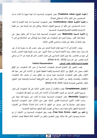 جميع الحقوق محفوظة ـ اإلعتداء على حق المؤلف 20 بالنسخ أو الطباعة يعرض فاعله للمسائلة القانونية16أ( القيمة التنبؤية value Predictive :تتال ل محات يبلل محاسبةلنمل املل نامل تللميمل إامل لبكتل تيب لمحاياد ينيل ىلمحاللملتلب م لمحاياقل لح النأو.لب ( القيمة التأكيدية value Confirmatory :تتال ل محات يبلل محاسبةلنمل املل نامل تأتن مل إامل لبكتلتيب ل محاياد ينيل ىل تأتن للأةللت سنحل محاللمملل محيبتقمىل ة بحابحىل دإنل لهل مح ممل تتل ل يل محقناملم ةا م مل)محا ل ملمحتصينم(لح ات يبللمحاسبةلنم.ن إام لبن لد ب ةنمث ىج( األهمية النسبية Materiality :تتال محات يبل محاسبةلنم بيم كيلنبن )ة بحابحى غن محا ام( محاى ا نملإتدبال محق م . ة تلب و أد قى دإن محات يبل غن مح بيم كيلنب مث لإثلبت بلأةل لد بل ىل م ملليياد ي لمحاقب ي لمحابحنم.لةت لمةلب ولإحىلأكهل لت ل لم لدبث ملحاس لياىل تال ل ل ل)أةليل ليتني(ل بالأةلغن ل با كيلنب نت تدا م م انم محليلنم يي يلنأو د قى ى ي لنتم ة نام محتل تبحليلم نىإحىلغن ه يي محتلبث . ة ق محت محاسبةل ى إ الب محتل محلق تقل نااه ي 5 %ييلثبد ل با كيلنب (2018., al et Kieso .(ن مح دلللتل لغنالراصية الرئيسية الثانية : التعبير ال ادق : Representation Faithfull ق ل تبحاتلن ل )أة محااثنل(ل مح ب ،ل ح ات يبلل محاسبةلنمل أنل تتل ل ت لل محات يبلل يل مح م ةلتبحمتلىلتاتلىلآد لمحا مد لينيلم بالمحاسبةلنملةمحقناملمحسقنقنملح ا م لأةلم م ل محاىلتتل ل ل بلت للم با. ةحمى تم ن محات يبل محاسبةلنم يتل و ت ، ي مح م ةى أن تا ت ل محات يبللتبةتااباىل ةمحسنب مىل ةمحد ل ييل م دتب ل ةاحلل ىل محلس ل محابح ) نكم محاسبةلم ةمحا م تم ح ةا محد نجىمة ب محامب نا ح اسبةلملمحابحنم؛ 2018.,al et Kieso:)أ( اإلكتمال Completeness :ق لتبةتاابالأنلتنااللمحاقب ي لمحابحنمل ىللللمحات يبللمحاىلتتال لا ة يملح اتلن لمح ب ،ل يلمحا م لمة ا ب ملأةلم م ل محاىلأ للييلأ بلت للمحات يبل.لب ( الحيادية Neutrality :تتال ل محات يبلل محاسبةلنمل نب مل إامل لبكتل غن ل ياسن ول حمكمل يتنلمل ىل يبب محمكبل م د ق محاياد يم ح اقب ي محابحنم. دت ى ةلنل محاثباى تتال محات يبل محاسبةلنملياسن ول )غن ل نب م(ل ة ل تتل ل ت ،ل يل مح م ةىل إامل بيتل إ م وللمحالنأو تبحا ب ول د ل محاق مللن محاسب د محا ثل إحن ب حاسقن ي بحس ب محند نم.ةلنم حاسقن كاب ج يتنلم ت غ ييلقبج( الر و م األخطاء Errors from Free :ق ل تد ل محات يبلل محاسبةلنمل ييل م دتب ل أنل ا لإ م بلة ا بلتأ ىل ملياصلم.لةحنالمحاق لتبحد لييلم دتب لمح ملمحات قمل)ثم لأدتب (ىل