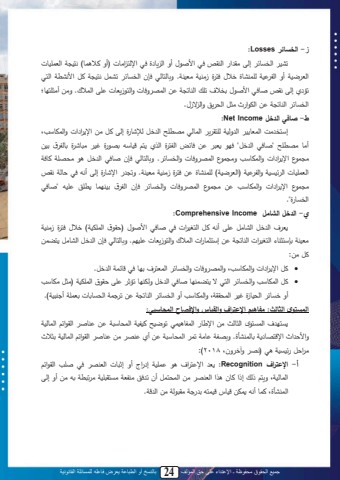 جميع الحقوق محفوظة ـ اإلعتداء على حق المؤلف 24 بالنسخ أو الطباعة يعرض فاعله للمسائلة القانونية20ز- الرسائر Losses :تنن لمحديب لإحى يق م لمحلقصلد لم ث ا أةلمح يب ولد مةحا ميبلل)أةلل اب(لكان ملمحتا نبلل محت انم أة محم نم ح النبول د ا دا و زيلنم يتنلم. ة بحابح ل دإنل محديب ل تنالل كان مل للل م كنتم محا لتم ملإحىلكقصلثبد لم ث ا تد لت للمحلبت مل يلمحا ةدبللةمحا زيتبلل ىلمحا . ةييلأيث ا ب؛لمحديب لمحلبت مل يلمحم م ليثللمحس ي لةمح زا.ط- صافي الدخل Income Net :إةاد يتلمحاتب ن لمح ةحنملح اق ي لمحابح لي ت حلمح دللحإللب ولإحىللللييلمة م ملل ةمحاصبة ىلأيبل ي ت حل \ثبد ل مح دل\ل د ل تل ل يل دب ضل محما ول محلمل ا ل نبةهل ت لو غن يلبل و تبحم ، ينيي ا للمة م ملل ةمحاصبة ل ةي ا ل محا ةدبلل ةمحديب . ة بحابح ل دإنل ثبد ل مح دلل ل يس مل لبدملمحتا نبللمح نينملةمحم نمل)محت انم(لح النبول يلدا ولزيلنمليتنلم.لةت لمةلب ولإحىلأكهلد ل بحملكقصلي ا للمة م ملل ةمحاصبة ل يل ي ا ل محا ةدبلل ةمحديب دإن محم ، ينل اب ت نه \بد محديب و\.ي- الدخل الشامل Income Comprehensive : ت ل مح دلل محنبيلل ىل أكهل للل محا ن ملل د ل ثبد للم ث ا ) ق ، محا منم( د ا دا و زيلنميتنلملتإةاثلب لمحا ن مللمحلبت مل يلإةاثاب مللمحا لةمحا زيتبلل ن .لة بحابح لدإنلمح دللمحنبيلل اضايلتلليي:• تللمة م ملل ةمحاصبة ىلةمحا ةدبللةمحديب لمحاتا لي بلد ل ب املمح دل.• تل محاصبة ةمحديب محا اضال ب ثبد مح دل ةحمل ب تمث ى ق ، محا منم )يثل يصبة أةلديب لمحسنبزولغن لمحاسققمىلةمحاصبة لأةلمحديب لمحلبت مل يلت املمحسيبتبللتتا ملأ للنم(.لالمستوى الثالث: مفاهيم اإلعتراف والقياس و اإلف اح المحا بي: يا لمحايا ق محثبحت يي مة ب محامب نا ت انحللنمنملمحاسبةلمل يل لبث لمحق م لمحابحنملةلم م ل مة ا ب ملتبحالنأو.لة ممل بيملتا لمحاسبةلمل يلأمل ل لييل لبث لمحق م لمحابحنمليث لي م لل نينمل ل)ك لةلآلد ةنى 2018:)أ- اإلعتراف Recognition :ت للمة ا م ل ا نمل إ موللأة إثلبلل محتل ل د ل ث ل محق م لمحابحنمىلةيا لاحللإامللبنل لملمحتل لييلمحاسااللأنلت د ليلمتمليياقل نملي تلتملتهلييلأةلإحىلمحالنأوىللابلأكهل اصيل نبجل نااهلي مليقل حم ييلمح م.