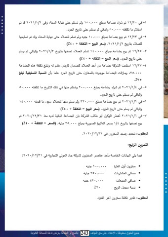 جميع الحقوق محفوظة ـ اإلعتداء على حق المؤلف 64 بالنسخ أو الطباعة يعرض فاعله للمسائلة القانونية601 .ثبد ل دللمحما و.ل2 .محاأثن لمحا اةلح ا نن لد لمحينبةبللمحاسبةلنملمحاالتملةت ي لم دتب لمح يم.3 .محاتبي ل ى أ ج محابا ية أثسبب ق ، محا منم ةمحا زيتبل ح .4 .ثن لم ب لةمحديب محا ملد لي م ملمحما ولةد لتب يخلمحان مكنملةمحس لملد المحما و.ل5 .لبث لمح دللمحنبيللم د لمحاا متامل.لةتت ،لمحقب املتبحنصللمآلت ل:شركة .......... قائمة التغيرات في حقوق الم كية ع السنة المنتهية في 31 ديسمبربيا رأس المال األ هم أرباح محتجيخ بنود الدخل الشامل اإلحتيا يات إجمالي حقوقالم كية رصيد أول الفترخ ××× ××× ××× ××× ×××+ تعديالت أخطاء نوات ابقة ××× ×××+ األثر التراكمي ع تغيير الطرقالمحا بية××× ×××صافي الدخل ××× ×××عناصر الدخل الشامل االخر ××× ×××االحتيا يات )××( ×××التوزيعات المع نة )××( )××(إ ثمارات إضافية ل مالك ××× ×××األرصدخ في آخر الفترخ ××× ××× ××× ××× ×××مثال)12 : )فيما ي ي البيانات المستررجة م القوائم المالية لشركة السالم في نهاية عام 2020 وهي : 1 -ي تلأ ث ولمةالمحما ولح سيبتبلللابل :ل أجل يبال م ة لل300000 لنهل ,ل مة انب لل175000 لنهل ,ل م ب ل محاسا ولل200000 لنهىللمح دللمحنبيللغن لمحاسق ل25000 لنهل.ل2 -ي تللت زيتبللم ب ل000.130 لنهلىلينلابلمة انب نبلل25000 لنه.ل