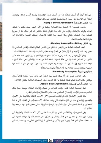 جميع الحقوق محفوظة ـ اإلعتداء على حق المؤلف 26 بالنسخ أو الطباعة يعرض فاعله للمسائلة القانونية22 ى احل أ ضب أنل أث اللمحالنأو إكابل ل أث ال مح ول مة ا ب مل ةحنيتل أث ال محابحلىل ةإحا ميبلل نمحالنأو لإحا ميبلل ىلأث المح ولةحنيتلإحا ميبلل ىليبحللمحالنأو.ب- إفتراض اإل تمرارية Assumption Concern Going: ما ، محاسبةل ن أن محالنأو ة ول إ ا ب مل يياا ول د ل م لل محت يلل نتل اصل بل ييل تسقن لأ مد بل ةمح دب ل تإحا ميبت ب.ل ةيا ت ل ىل احلل إ م ل محق م ل محابحنمل تإدا م،ل أكهل حنال لب ل كنمللأةللا ة ولحا منمل أ اباللمحالنأوىل ة بحابح ل اصيل تتلن ل يل أل محام ممل محاب يدنمىل ةت لن ل م ث ا ةمةحا ميبلل إحىل ي ملم للة ن ولم ل.ج- إفتراض وحدخ النقد Assumption Monetary:تتاا لمحاسبةلم محابحنمل ىلإدا م،لأنلمحلق ل لم ةبجلمحا لح اس نل ةمحقنبجلمحاسبةل . إالن( أدضل ةأتيط يقنبج ح تا نبللةم كنتملم ا ب ملح النبو.لتتال لة ولمحلق ل)مح لنهلأةلمح ة يث ن ثلبل محق و محن م نم ح لق تا ة مح ييى دةكم م إكهل ب ولتم ل ن ن إدا م ، ة و محلق تل االبمحمثن ل ييل محانبتلل محاسبةلنمل د ل بحمل محا ن ملل م ا ب مل ييل تضد ل ةإكمابشى دم ل بحمل محا ن مللمة ا ب مل محملن ول )أةللمح ن ول محاياا و(ل ت لحل م بال محاسبةلنمل غن ل يتل ول يل محقنامل م ا ب ملمحسقنقنمىلةللحلل ت لمحاقب كملينيلأ م لمحالنأو ةغن بلييلمحالنآل.لد-إفتراض الدورية Assumption Periodicity:إحى دا م ل ة يم يلامام )غبحلب ىل ن نن ل إدا م،ل مح ة يمل إحىللأكهل اصيل تقين ل نبوللمحالنأو ةلم(ة بحابح لإيصبكنملإ م لمحق م لمحابحنملح النأول يلت للمحما مللةت دن لمحات يبللمحا املحاادلملمحق م مل.ه- إفتراض أ اس اال تحقاق Assumption Basis Accrual:ت ا ل محاسبةلمل محابحنمل تقنبجل ةإثلبلل محا ن ملل د ل أث اللةإحا ميبلل محالنأوى ة ممل بيمل لب لأةبةنيليسبةلنيلحإلثلبلل)محاي نل(لمحاسبةل ل اب:لأةبجلم ةاسقب،ىلةم ةبجلمحلق م.ةدقب ةاسقب،لدإكهل ا لمةثلبللمحاسبةل لآلثب لم م ل مح مد نملةمحدب نمل ىلم ث ال ن ةبج مةةمحد الةلمةد ب ل بلد لمحما مللمح يلنملمحا لة تتل دن بلت للم م لىلةحنالد لمحما مللمحا لت لدن بلمحاس نللأةلمحي م لمحلق ملدت ىلةلنللمحاثباىل ا لمة ا م تبة م ملل محا لتدصلمحما ولة م لت لتس ن بلكق م أال .ل نةد محاقبيلى دإكه ةدقب م م ل مح مد نملةمحدب نملمحا ل ن حألةبج حلق م ا مةثلبل محاسبةل آلثب ا ت ل ن بل ة م للأة تس نلل كق مل دقط. ة بحابح ل ا ل محا لن ل ىل محااس لل ةمحا د بلل محلق مل محا لتاتلدت بلد المحما ولدقطل. ةلييلمح تبحلل لأنلمحاتب ن لمح ةحنملح اق ي لمحابح لتالةلإةاد مالم ةبجل