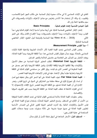 جميع الحقوق محفوظة ـ اإلعتداء على حق المؤلف 27 بالنسخ أو الطباعة يعرض فاعله للمسائلة القانونية23محلق ملد لمةثلبللمحاسبةل لإ لد ل ب لليس ة ول)يثللمحاسبةلمل ىليصبت لمحا يلمحس وللبحاسبة ىلةمحتلن ...(ىل ةاحلل نل إةاد مال لمل م ةبجل اتب ،ل يةل يلب لللمة ا م تبة م ملل ةمحا ةدبلل محا لن تإان ل.ةنا يلب نا ب قبثانيا : Principles Basic : المبادئ األ ا ية إلعداد القوائم الماليةإلااللمة ب لمحامب نا لح اسبةلملمحابحنمل ىلأ تمليلب للأةبةنملة م لمحق م لمحابحنملة :ليل ألمحقنبجىلةيل ألمة ا م تلبة م مللىلةيل ألمة ا م تبحا ةدبلىلةيل ألمةد ب محمبيللةاحلل ىلمحلس لمحابح لل )2018., ; al et Kieso نكمل محاسبةلمل ةمحا م تمل ح ةال محد نجىل مة ب ل محامب نا لح اسبةلملمحابحنم(:لأ- مبدأ القياس Principle Measurement : داصل محقنبجل محاسبةل ل ياس للمحقنامل محلق مل آلثب للم م ل محدب نمل ةمح مد نمللمحقبي م حإلثلبللمحاسبةل لتلبحالنأو. ةي ليل أنليقل نلح قنبجلمحاسبةل ل اب:ليل ألمحام مملمحاب يدنمىلةيل ألمحقناملمحتب حمىلةيتاا لمةدانب لينيلمحال لأ يل ىلمحامبا ملينيلدبثناىلمحا املةمحاتلن لمح ب ،.- التك فة التاريرية Cost Historical :تات ل محاتب ن ل مح ةحنمل محاسبةلمل يل يتم للم ث ال ةمةحا م يبل ةدقب ممل مة الب (.ل ةتاان ل محام ممل محاب يدنمل تألك بل تتل ل ت ،ل يل ن حام ما ب محاب يدنم )تم محقنامل محا د مل د ل محتل ل محلمل ا ل نبةه.ل ةيث ل محمثن ل ييل يياد ي ل محق م ل محابحنمل د ل محام مملمحاب يدنم تإ الب ب يقنبةب اصيلمة ااب ل نهلد ل نبجلمةت ب بللمحاب يدنملحقناملمحتل .ل ن- القيمة العادلة Value Fair :تت لمحقناملمحتب حمل ىلأك بلمحيت لمحلمل اصيلتسقنقهلحلنة أثللأةللحي م ل)أةللتس يل( إحا م ا د ثمقم يلمام يني محانب لني د محي ، د تب يخ محقنبج. ةت مةلب و إحى أن محقنام محتب حم تايبةق ية محام مم محاب يدنم ح تل تب يخ مة الب )مةةاس ما(ىل إ لأكهلد لمحما مللمح قمل لتدا لمحقناملمحتب حمل يلمحام مملمحاب يدلنملتيل لت ن لمحم ة لمحي نملةمة ا ب م.لةتتال ليت يبللمحقناملمحتب حملي املحاياد ي لمحق م لمحابحنملد لتس لمحا دقبللمحلق ملمحاا تملييل م ثلللأةللمةحا مال د ل محاياقلل.ل ةتياحل محاتب ن ل مح ةحنمل ح النألل تإةاد مال كا اول محقنامل محتب حمل د ل نبجللم ث ا ةمةحا ميبلل محابحنم.ل ة ل ألب لل محاتب ن ل مح ةحنمل ح اق ي ل محابح ل إحىل محا ب ل م ةبةنملحاقب نال محقنامل محتب حمل د ل ث ول ينمل يا مل ىل ث ثمل ييا يبلل ي ل ك نمل ي د لل محاقنن لمحاياد يملد ا نملمحقنبجلة :- المستوى االول: م لةتب لمحانب ولد لأة م،لكنتمل ثللأةلإحا ماليابثل.ل