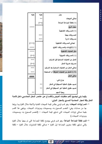 جميع الحقوق محفوظة ـ اإلعتداء على حق المؤلف 40 بالنسخ أو الطباعة يعرض فاعله للمسائلة القانونية36بيا جنيه جنيهصافي المبيعات ××)-( تك فة البضاعة المباعة )××(مجمل الربح ×××× )-( الم روفات التشغي يةالم روفات بيعية ×××م روفات ادارية ××× اجمالي الم روفات التشغي ية )×××()-/+(اإليرادات والم روفات االخري ×××× دخل العم يات التشغي ية ×××× )-( الم روفات التموي ية )××(الدخل م العم يات المستمرخ قبل الضرائب ×××م روف ضريبة الدخل )××(صافي الدخل م العم يات المستمرخ بعد الضرائب ×××)+/-( الدخل م العم يات المتوقفة أو المستبعدخ ×××صافي الدخل ×××× يوزع ع ي:ن يب حقوق الم كية المسيطرخ في الدخلن يب حقوق الم كية غير المسيطرخ في الدخل ××××ربحية السهم ×× وفيمدا ي دي توضديح ألهدم متط بدات العدرض واالف داح عد عناصدر الددخل المحا دبي داخدل قائمدة الدخل وفقا لمعيار المحا بة الم ري والمعيار الدولي:1 -قسم إيرادات المبيعات: ة ل ي لد ل تصال ناملمحالنتبللمحلق ملةم ملد المحما ولةيبل تلطلي بل ييل يبتبلل ة :ل محد ل محايا ل تهىل ةييا بلل ةي ة ملل محالنتبل.ل ةيلا ل لمل محقي لتقنام ثبد إ م مل محالنتبل محا تيبةم نام محالنتبل – )محد ل محايا ل تهىل ةييا بللةي ة مللمحالنتبل.(2 -قسم تك فة البضاعة المباعة:ل ة ل ي ل د ل احل تم ممل محلضب مل محا ل ت ل ينت بل د ال محما ولةمحا تيبةم تم مم يد ةن محلضب م مةا محما و + ثبد تم مم محانا يبل د ا محما و – تم ممل