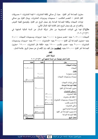 جميع الحقوق محفوظة ـ اإلعتداء على حق المؤلف 41 بالنسخ أو الطباعة يعرض فاعله للمسائلة القانونية37يد ةن محلضب م أد محما و. نتل أنل ثبد ل تم ممل محانا يبلل = نامل محانا يبلل +ل ي ةدبللمحلقلل ح مدللل– محد ل محاصاي لل- ييا بلل ةي ة ملل محانا يبل. ةياثل محم ، يني ثبد إ م ملل محالنتبلل ةتم ممل محلضب مل محالب مل ل ي الل مح حل يل محما و.للةحا انحل لنمنمل محت ،لةم د ب ل يل لي اللمح حل مدللمحقب املمحنللمحاثبالمحابح :مثال)2 )دنابل ل محلنبكبلل محاياد مل ييل دبت ل ل لمل محي ال يل محيلمل محابحنمل محالا نمل د ل31/12/2020:محالنتبلل000.050.1 لنهل–د لييا لتهل000.10 لنهل–ي ة مللةييا بللمحالنتبلل000,40 لنهل–يد ةن محلضب م أةا محما و 000,300 لنهلل–محانا يبللل000.820 لنهلل–ي ة ملل ةييا ل بللمحانا يبللل000,20 لنهلل-د ل يصاي لل15000 لنهلل–تم ممل كقلل محانا يبللل000.15- يد ةنمحلضب ملآد لمحما ول000.450 لنه. المط وب: ينبنللن ل ا لمةد ب ل يلي اللمح حللتقب املمح دل.الحلشركة االمل قائمة الدخل )جيئية( ع السنة المنتهية في 31/12/2020بيا جنيه جنيهإيرادات المبيعات:محالنتبلل 000.050.1 ت لد لييا لته 000.10ي ة مللةييا بللمحالنتبلل 000.50)000.50)ثبد لإ م مللمحالنتبلل 000000.1تك فة البضاعة المباعة:يد ةن محلضب م أةا محما و 0000.300+لثبد لمحانا يبلتم مملمحانا يبلل 000.820+لتم مملكقللينا يبلل 0000.15)-(لي ة مللةييا بللمحانا يبلل )000.20))-(لد ليصاي ل )000.15)ثبد لمحانا يبلل 000.800محلضب ملمحااب ملح لنة 000.100.1)-( يد ةن محلضب م مد محما و )000.450)تم مملمحلضب ملمحالب مل )000.650 )مجمل الربح 000.350