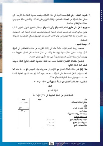 جميع الحقوق محفوظة ـ اإلعتداء على حق المؤلف 46 بالنسخ أو الطباعة يعرض فاعله للمسائلة القانونية427 -ضريبة الدخل: وهي تمثل ملمح ةحملد ل دللمحن لم.لة د و لاو يلملمحو دلل وا لمحا ثوللإحوىلثبد ل دللمحن لملييلمحتا نبللمحاياا و.لةمحقبيوللح ا زيوةل وىلمحاو .لةاحوللدو ل بحومل و الة و ل ا نبلليا مملأةلييالت و.8 -توزيع الدخل ع ى حقوق الم كية المسيطرخ وغير المسيطرخ : ات لمحاتنب لمح ةح لح اقب ي لمحابحنوملت زيوة ثوبد محو دل إحوى ك ون حسقو ، محا منوم محايونت و ةك ون حسقو ، محا منوم غنو لمحايونت و.لةيووا لمةد ووب ل وويل وولملمحا زيووةلدوو لك ب وومل ب اووملمحوو دللتتوو لمح ثوو الثووبد لمحوو دلليوويلمحتا نووبللمحاياا و.ل9 -ربحية السهم : ُ د إتدبا محق م م ل يي بك محااتبي ني د أة م،ن بيبأثلست سنم محي مح م بي ن محاباى ة ب و يبتم ن ا نم ة م ةةماسم ةاحل يي يلهد ا يام ثبد مح دل يت ة بن ى م ة محتب م محقب ام.ت زيتبل أ ب ا م م ة محااابزو يقي يب لتوضيح متط بات اإلف اح الراصة بم روف الفائدخ وضريبة الدخل وتوزيع الدخل وربحية السهم إليك المثال التالي:مثال ) 4 )كمالينبكبللمحاثبالمحيبي ليةلمدا م،لمنلي ة لد م لمحق ة،لي غل5000 لنهللابلي تل ا م ل مح دلل محاياسقمل ىل محن لملل000.10 لنه.ل لابل ي غل ل م ة ل محتب مل محقب املل000,100ة ىلةمنلكيلملمحا منملمحاينت ول70.%المط وب: إعداد قائمة الدخل ع السنة المنتهية في 31/12/2020 . الحل: شركة السالم قائمة الدخل ع السنة المنتهية في 31/12 /2020بيا جنيه جنيهصافي إيرادات المبيعات: 000000.1 ت لتم مملمحلضب ملمحالب مل )000.750 )ي اللمح ح 000.250 ت : الم روفات التشغي ية:الم روفات البيعية:مرتبات وعمولة رجال البيع 000.40م روفات نقل ل رارج 7000اهالك معارض البيع 000.30