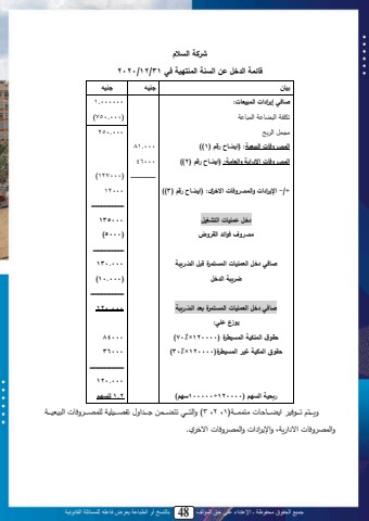 جميع الحقوق محفوظة ـ اإلعتداء على حق المؤلف 48 بالنسخ أو الطباعة يعرض فاعله للمسائلة القانونية44شركة السالم قائمة الدخل ع السنة المنتهية في 31/12 /2020بيا جنيه جنيهصافي إيرادات المبيعات: 000000.1تم مملمحلضب ملمحالب مل )000.750)ي اللمح ح 000.250الم روفات البيعية: )ايضاح رقم )1 ))000.81الم روفات االدراية والعامة: )ايضاح رقم )2 ))46000وووووووووووووووووووووووووووووووووووووووول )127000)+/- اإليرادات والم روفات االخرى: )ايضاح رقم )3 ))12000ددددددددددددددددددددددددددددددددددددددد دخل عم يات التشغيل 135000م روف فوائد القروض )5000)ددددددددددددددددددددددددددددددددددددد صافي دخل العم يات المستمرخ قبل الضريبة 000.130ضريبة الدخل )000.10)دددددددددددددددددددددددددددددددددددددددد صافي دخل العم يات المستمرخ بعد الضريبة 000.120يوزع ع ي: حقوق الم كية المسيطرخ )120000%×70 )84000حقوق المكية غير المسيطرخ)120000%×30 )36000ددددددددددددددددددددددددددددددددددددددددد 000.120ربحية السهم )120000÷100000 هم( 2.1 ل سهم ةيوووووا لتووووو دن لم ضوووووب بللياااوووووم)1ىل2ىل3)لةمحاووووو لتاضوووووايل ووووو مةالتم ووووون نملح ا ووووو ةدبللمحلنتنوووووملةمحا ةدبللم م يمى ةمة م مل ةمحا ةدبل م د م.