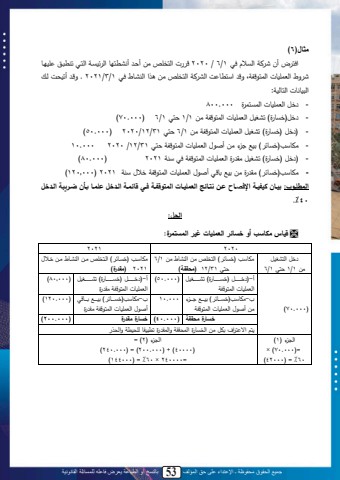 جميع الحقوق محفوظة ـ اإلعتداء على حق المؤلف 53 بالنسخ أو الطباعة يعرض فاعله للمسائلة القانونية49مثال)6)مدا ،لأنلل لملمحي الد ل1/6 / 2020 للمحاد صلييلأ و لأكنوتا بلمح نيوملمحاو لتلتلو ل ن وبلل ةطلمحتا نبللمحاا ممىلة لمةاتب تلمحن لملمحاد صلييل لملمحلنوبطلدو ل1/3/2021. لة و لأتنسوتلحوللمحلنبكبللمحابحنم:- دللمحتا نبللمحاياا وللل000.800- دل)ديب و(لتن نللمحتا نبللمحاا مملييل1/1 ا ل1/6( 000.70)ل- ) دلل)ديب و(لتن نللمحتا نبللمحاا مملييل1/6 ا ل31/12/2020( 000.50)ل- يصبة )ديب (لينةل لييلأث المحتا نبللمحاا ممل ا ل31/12 /2020 000.10- ) دلل)ديب و(لتن نلليق ولمحتا نبللمحاا مملد لةلمل2021( 000.80)ل- يصبة )ديب (ليق ولييلينةلتب لأث المحتا نبللمحاا مملد الةلملل2021( ل000,120)لالمط دوب: بيدا كيفيدة اإلف داح عد نتدائج العم يدات المتوقفدة فدي قائمدة الددخل ع مدا بدأ ضدريبة الددخل 40.%الحل: قياس مكا ب أو خسائر العم يات غير المستمرخ:2020 2021 دللمحان نللييل1/1 ا ل1/6يصبة ل)ديب (لمحاد صلييلمحلنبطلييل1/6 ا ل31/12( محققة(يصبةو ل)ديوب (لمحواد صليويلمحلنوبطليويلدو ال2021( مقدرخ()000.70)لأ-) دوووووووووولل)ديووووووووووب و(لتنووووووووووو نللمحتا نبللمحاا مم)000.50 )أ-) دووووووووووولل)ديوووووووووووب و(لتنووووووووووو نللمحتا نبللمحاا ممليق و)000,80)ب-يصبة )ديووووب (لينوووووةل ووووو لييلأث المحتا نبللمحاا مم000.10 ب-يصبة )ديوووووب (لينوووووةلتوووووب لأث المحتا نبللمحاا ممليق و)000.120)خسارخ محققة )000.40 )خسارخ مقدرخ )000.200) ا لم ا م لتصللييلمحديب ولمحاسققملةمحاق ولتتلنقبلح سنتملةمحسل مح ل)1)ل=)000.70)ل×ل60= %ل)ل42000)لمح ل)2)ل=ل)40000)ل+ل)ل000.200)ل=ل)ل000.240)ل=240000 × 60= %ل)144000)ل