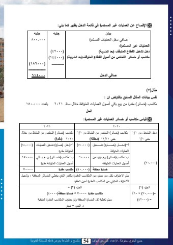 جميع الحقوق محفوظة ـ اإلعتداء على حق المؤلف 54 بالنسخ أو الطباعة يعرض فاعله للمسائلة القانونية50 اإلف اح ع العم يات غير المستمرخ في قائمة الدخل يظهر كما ي ي:بيا جنيه جنيه ثبد ل دللمحتا نبللمحاياا ول 000.800العم يات غير المستمرخ: دخل تشغيل القطاع المتوقف )بعد الضريبة( )42000)مكا ب أو خسائر التر ص م أصول القطاع المتوقف)بعد الضريبة( )144000)ددددددددددددددددددددددددددد )186000)ددددددددددددددددددددددددددددددددددددد صافي الدخل 614000مثال)7)نفس بيانات المثال السابق بافتراض ا :يصبة ل)ديب (ليق ولييلينةلتب لأث المحتا نبللمحاا مملد الةلملل2021 ي تل000.150 الحل قياس مكا ب أو خسائر العم يات غير المستمرخ:2020 2021 دللمحان نللييل1/1 ا ل1/6يصبة ل)ديب (لمحاد صلييلمحلنبطلييل1/6 ا ل31/12( محققة(يصبة ل)ديب (لمحاد صلييلمحلنبطليويلدو ال2021( مقدرخ()000.70)أ-) دووووووووووولل)ديوووووووووووب و(لتنووووووووووو نللمحتا نبللمحاا مم)000.50 )أ-) دولل)ديوب و(لتنو نللمحتا نوبللمحاا ممليق و)000,80)ب-يصبة )ديب (لينةل و ليويلأث المحتا نبللمحاا مم000.10 ب-يصبة )ديووووووب (لينووووووةلتووووووب لأث المحتا نبللمحاا ممليق و150000خسارخ محققة )000.40 )مكا ب مقدرخ 70000 وا لم او م لتصولليويلت و ليويلمحاصبةو لمحاقو ولتبحقو لمحولمل تو لمحديوب لمحاسققوملىلةتب نوللم ا م لمحاالق لييلمحاصبة لمحاق ولحسنيلتسقق بمح ل)1)=)000.70 × )60 %= )42000)مح ل)2= )مكا ب مقدرخ 70000 < خسارخ محققة)40000 )ةنا لت تنمللللمحديب ولمحاسققملةحيل تا لمحاصبة لمحاق ولمحاالقنمل:.لمح ل=لثم ل