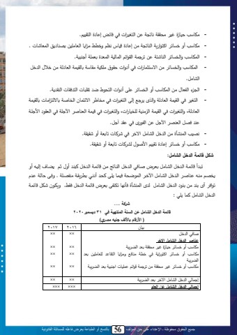 جميع الحقوق محفوظة ـ اإلعتداء على حق المؤلف 56 بالنسخ أو الطباعة يعرض فاعله للمسائلة القانونية52- يصبة ل نبزولغن ليسققملكبت مل يلمحا ن ملل د دب ضل إ ب و محاقنن .ل- يصبة لأةلديب لمتا م يملمحلبت ملييلإ ب و نبجلكم لةدتطلي م بلمحتبي نيلت لب لمحاتبلبلل.- محاصبة ل ةمحديب محلبلكم ي ت ام محق م محابحنملمحات ولتتا ملأ للنم.- محاصبة ل ةمحديب يي م ةاثاب ملل د أ ةملل ق ، ي منم يقبةم تبحقنام محتب حم يي د ا مح دلمحنبيل.- مح محمتبا يي محاصبة لأةلمحديب ى أ ةملل محاس ط ا لتق لبلل محا دقبلل محلق م.- محا ن لد لمحقناملمحتب حملةمحلقل ةلإحىلمحا ن مللد ليدب لم اابنلمحدبثملتب حا ميبللتبحقناملمحتب حمىلةمحا ن مللد لمحقناملمح يلنملح دنب ملىلةمحا ن مللد ل ناملمحتلبث لمآل ملد لمحتق لم ومل ل د ل محتل مآل ل ي محم ق د ق لآ ل.- ك ن لمحالنأولييلمح دللمحنبيللم د لد لل لبللتبتتملأةللقنقم.- يصبة لأةلديب لإ ب ولتقنن لم ث الحن لبللتبتتملأةللقنقم.شكل قائمة الدخل الشامل: تلو أل ب اوملمحو دللمحنوبيللتتو ،لثوبد لمحو دللمحلوبتجليويل ب اوملمحو دلللللو لأةالثو لل ضوب لإحنوهلأةل د و ليلوهل لبثو لمحو دللمحنوبيللمآلدو لمحا اوسملدناوبل وىللسو لأ كو لتت يقومليلم و مل.لةدوىل بحومل و الت مد لأقليل لييليل لمح دللمحنبيلللح قلمحالنأولدأك بلتمامىلتت ،ل ب املمح دل دقط. ةيصو ن لوصل ب اوممح دللمحنبيلللابل ل:لشركة .... قائمة الدخل الشامل ع السنة المنتهية في 31 ديسمبر2020) األرقام باأللا جنيه م ري(ينبن 2016 2017ثبد لمح دللعناصر الدخل الشامل االخر يصبة لأةلديب ل نبزولغن ليسققملتت لمحض يلمليصبة ل أةللديب ل متا م مل د ل دتمل يلبدةل ةي م بل محاقب ل ح تبي نيل تت لمحض يلمليصبة لأةلديب لغن ليسققملييلت امل م ل ا نبللم للنملتت لمحض يلمل××××××××××××××××إ ابح لمح دللمحنبيللم د لتت لمحض يلمل ×× ××إجمالي الدخل الشامل ع العام ××× ×××