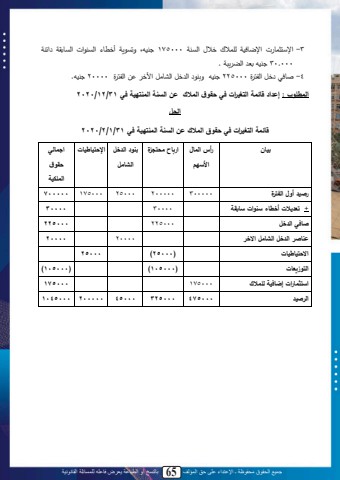 جميع الحقوق محفوظة ـ اإلعتداء على حق المؤلف 65 بالنسخ أو الطباعة يعرض فاعله للمسائلة القانونية613 -مةةاثاب لل مةابدنمل ح ا ل د ال محيلملل175000 لنهىل ةتي يمل أدتب ل محيل ملل محيبتقمل م لمل000.30 لنهلتت لمحض يلمل.4 -ثبد ل دللمحما ول225000 لنهللة ل لمح دللمحنبيللم د ل يلمحما ولل20000 لنه.لالمط وب : إعداد قائمة التغي ارت في حقوق المالك ع السنة المنتهية في 31 /12/2020الحلقائمة التغي ارت في حقوق المالك ع السنة المنتهية في 31/1/2/2020بيا رأس المال األ همارباح محتجيخ بنود الدخل الشامل اإلحتيا يات اجمالي حقوقالم كية رصيد أول الفترخ 300000 200000 25000 175000 700000+ تعديالت أخطاء نوات ابقة 30000 30000صافي الدخل 225000 225000عناصر الدخل الشامل االخر 20000 20000االحتيا يات )25000 )25000التوزيعات )105000( )105000)ا تثمارات إضافية ل مالك 175000 175000الرصيد 475000 325000 45000 200000 1045000