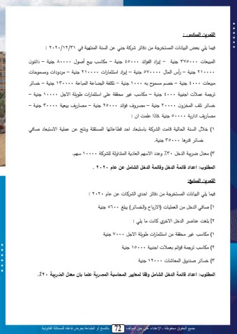 جميع الحقوق محفوظة ـ اإلعتداء على حق المؤلف 72 بالنسخ أو الطباعة يعرض فاعله للمسائلة القانونية68التمري السادس : دنابل لتتضلمحلنبكبللمحاياد ملييل دبت لل لمل ل ل يلمحيلملمحالا نملد ل31/12/2020: محالنتبللل375000 لنمل لل- إ م ل محم م لل45000 لنملل- يصبة ل ينةل أث الل80000 لنملل– م ل ن210000 لنمل– أجلمحابال570000 لنمل– إ م لمةاثاب ملل210000 لنمل– ي ة مللةييا بلليلنتبلل4000 لنمل– د لييا لتهل1000 لنمل- تم مملمحلضب ملمحالب مل130000 لنمل– ديب لت امل ا للم للنمل4000 لنمل– يصبة لغن ليسققمل ىلمةاثاب ملل ي ملم لل10000 لنمل– ديب ت محاد ةن 20000 لنمل– ي ة لد م ل25000 لنمل– ي ب يفلينتنمل30000 لنمل– ي ب يفلم م يمل50000 لنمل.دبامل اتلمنل:ل1)ل د ال محيلمل محسبحنمل بيتل محن لمل تبةالتب ل م ل تب بت بل محاياق مل ةكاجل يل ا نمل م ةالتب ل ثبد لديب ل بل35000 لنم.3)ليت الا يلملمح دلل30 %ة لم ة لمحتب ملمحاا مةحملح ن للمل10000 ة .لالمط وب: اعداد قائمة الدخل وقائمة الدخل الشامل ع عام 2020 . التمري السابع:دنابل لمحلنبكبللمحاياد ملييل دبت لم ملمحن لبلل يل بال2020: 1]لثبد لمح دللييلمحتا نبلل)م ب لةمحديب (ل ل غل5600 لنمل2 ]ي ت لبث مح دل م د م لبكت يب :1)ليصبة لغن ليسققملييلمةاثاب ملل ي ملم لل7000 لنمل2)ليصبة لت امل م لتتا للم للنمل15000 لنمل3 )ديب ثل ة، محاتبلبل 12000 لنملالمط وب: اعداد قائمة الدخل الشامل وفقا لمعايير المحا بة الم رية ع ما با معدل الضريبة 20 .%