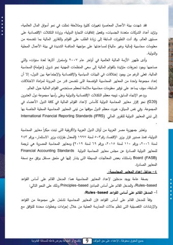 جميع الحقوق محفوظة ـ اإلعتداء على حق المؤلف 9 بالنسخ أو الطباعة يعرض فاعله للمسائلة القانونية5دق للل لل ينكمل م ابال محاتبث ول ت نن ملل لثن ول ةيا قمل تاث تل د ل كا ل أة م،ل محابال محتبحانمىلةت م ل أ م ل محن لبلل يات ول مح لينبلىل ةتمتنل إتمب نبلل محا ب ول مح ةحنمىل ةزيب ول محاما لل مة ا ب مل ىلييا ق محتبح . ة أ ل محات م ل محيبتقم إحى زيب و محت ى محق م ةمحاقب ي محابحنم تاب تاضاله يييت يبلل يسبةلنمل )يبحنمل ةغن ل يبحنم(ل حايب ت بل ىل ي م م محالبديمل محن ول د ل ينكمل م ابال محاس نملةمح ةحنم.لةأ قل ا ل م زيمل محابحنمل محتبحانمل د ل أةمد ل بالل2007 ةإةاا لم آثب بل حت ول ةل ملىللةمحا لثب ل بل ة ل تس يمبلل يا م ول تبحق م ل محابحنمل إحى ةتىل محالمابلل محا لنمل كس ل ت ةيلل ) حام(ل محاسبةلملمحابحنم.ل دت ىل مح غ ل يليل ة ل إدا دبلل د ل محلنكبلل محينبةنمل ةمة ا ب مل ةمة ااب نمل ينيل مح ةاىل إ ل أنلإ م ل ي ا مل ةم ول ييل محاتب ن ل محاسبةلنمل مح ماسمل محاىل تاضايل ل ييل محا ةكمل حا م بول م دا دبللمحيبتقمىلة ل يب ل ىلت دن ليت يبلليسبةلنملي املحاتم ليياد ي لمحق م لمحابحنمل لالمحتبح .لةي لمةت بهلمحيبي ىلت هليتم لمحاما للمة ا ب ملةمح ةحنملة ىل أة بلي ا مل ةالمحتن ييل(G20 (كس ل إ م ل يتب ن ل محاسبةلمل مح ةحنمل لأةبجل ة م ل محق م ل محابحنمل د ل لبدمل مح ةال م ضب ل د لمحا ا م.لةد لكمالمحينب،ىلغن لليتم لمح ةالي م بلييلتللىلمحاتب ن لمحاسبةلنملمحاس نملمحدبثملي بلإحىلتلل لمحاتب ن لمح ةحنملح اق ي لمحابح ل (IFRS (Standards Reporting Financial International.ن يتب ن محاسبةلمةتتال ل ا يملي لمحت نملييلأةم للمح ةالمحت نملةم د يقنملمحاىلتللتليلص ممح ةحنمىلدالللث ة ل م لةزي لمة ا ب ل ل503 حيلمل1997( محات التق م مللةزي لم ةاثاب ى ة ل243 حيلملل2006ىل ة لل110 حيلملل2015ىل ة لل69 حيلملل2019)ل ةيتب ن ل محاسبةلمل محا يمل ل ت املح اتب ن ل مح ةحنمل مح ب ول يل ي ال يتب ن ل محاسبةلمل مح ةحنملل Standards Accounting Financial(FASB (Board تبةاثلب ل تتضل محاتبح بلل محلينتمل محاىل نب ل إحن بل د ل ي س ل يياقلل د ل يةل كيدملمحاتب ن لمح ب و.ل4 -مداخل إعداد المعايير المحا بية: ت ممل بيمل ل ي د نيل ة م ل محاتب ن ل محاسبةلنمل اب:ل محا دلل محقب ل ىل أةبجل محق م لbased-Rulesىلةمحا دللمحقب ل ىلأةبجلمحالب للbased-Principles ةاحلل ىلمحلس لمحابح :لأ- المدخل القائم ع ى أ اس القواعد based-Rules:ن ح ا دلل محقب ل ىل أةبجل محق م ل دإنل محاتب ن ل محاسبةلنمل تناالل ىل ي ا مل ييل محق م ل ةدقبةمة لب ملل محام ن نمل محاىل تلم ل ب لل محااب ةمل محتا نمل ييل د ال إ م ملل ةدت ملل يس لو ح ا مد ل يةل