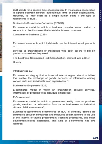 %u062c%u0645%u064a%u0639 %u0627%u0644%u062d%u0642%u0648%u0642 %u0645%u062d%u0641%u0648%u0638%u0629 %u0640 %u0627%u0625%u0644%u0639%u062a%u062f%u0627%u0621 %u0639%u0649%u0644 %u062d%u0642 %u0627%u0645%u0644%u0624%u0644%u0641 %u0628%u0627%u0644%u0646%u0633%u062e %u0623%u0648 %u0627%u0644%u0637%u0628%u0627%u0639%u0629 %u064a%u0639%u0631%u0636 %u0641%u0627%u0639%u0644%u0647 %u0644%u0644%u0645%u0633%u0627%u0626%u0644%u0629 %u0627%u0644%u0642%u0627%u0646%u0648%u0646%u064a%u0629101B2B stands for a specific type of cooperation. In most cases cooperation is agreed between different autonomous firms or other organizations. However, %u201cB%u201d may even be a single human being if the type of relationship is %u201cB2B%u201d. Business-to-Business-to-Consumer (B2B2C) E-commerce model in which a business provides some product or service to a client business that maintains its own customers Consumer-to-Business (C2B) E-commerce model in which individuals use the Internet to sell products or services to organizations or individuals who seek sellers to bid on products or services they need The Electronic Commerce Field: Classification, Content, and a Brief History Intrabusiness EC E-commerce category that includes all internal organizational activities that involve the exchange of goods, services, or information among various units and individuals in an organization Business-to-Employees (B2E) E-commerce model in which an organization delivers services, information, or products to its individual employees E-Government E-commerce model in which a government entity buys or provides goods, services, or information from or to businesses or individual citizens B2G e-commerce? Business-to-government e-commerce or B2G is generally defined as commerce between companies and the public sector. It refers to the use of the Internet for public procurement, licensing procedures, and other government-related operations. This kind of e-commerce has two features: