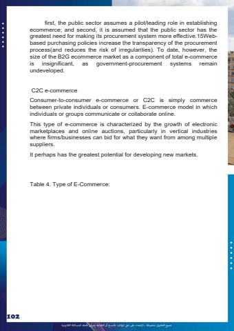%u062c%u0645%u064a%u0639 %u0627%u0644%u062d%u0642%u0648%u0642 %u0645%u062d%u0641%u0648%u0638%u0629 %u0640 %u0627%u0625%u0644%u0639%u062a%u062f%u0627%u0621 %u0639%u0649%u0644 %u062d%u0642 %u0627%u0645%u0644%u0624%u0644%u0641 %u0628%u0627%u0644%u0646%u0633%u062e %u0623%u0648 %u0627%u0644%u0637%u0628%u0627%u0639%u0629 %u064a%u0639%u0631%u0636 %u0641%u0627%u0639%u0644%u0647 %u0644%u0644%u0645%u0633%u0627%u0626%u0644%u0629 %u0627%u0644%u0642%u0627%u0646%u0648%u0646%u064a%u0629102first, the public sector assumes a pilot/leading role in establishing ecommerce; and second, it is assumed that the public sector has the greatest need for making its procurement system more effective.15Webbased purchasing policies increase the transparency of the procurement process(and reduces the risk of irregularities). To date, however, the size of the B2G ecommerce market as a component of total e-commerce is insignificant, as government-procurement systems remain undeveloped. C2C e-commerce Consumer-to-consumer e-commerce or C2C is simply commerce between private individuals or consumers. E-commerce model in which individuals or groups communicate or collaborate online. This type of e-commerce is characterized by the growth of electronic marketplaces and online auctions, particularly in vertical industries where firms/businesses can bid for what they want from among multiple suppliers. It perhaps has the greatest potential for developing new markets. Table 4. Type of E-Commerce: