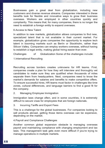 %u062c%u0645%u064a%u0639 %u0627%u0644%u062d%u0642%u0648%u0642 %u0645%u062d%u0641%u0648%u0638%u0629 %u0640 %u0627%u0625%u0644%u0639%u062a%u062f%u0627%u0621 %u0639%u0649%u0644 %u062d%u0642 %u0627%u0645%u0644%u0624%u0644%u0641 %u0628%u0627%u0644%u0646%u0633%u062e %u0623%u0648 %u0627%u0644%u0637%u0628%u0627%u0639%u0629 %u064a%u0639%u0631%u0636 %u0641%u0627%u0639%u0644%u0647 %u0644%u0644%u0645%u0633%u0627%u0626%u0644%u0629 %u0627%u0644%u0642%u0627%u0646%u0648%u0646%u064a%u062912Businesses gain a great deal from globalization, including new customers and diverse revenue streams. Companies interested in these benefits look for flexible and innovative ways to grow their business overseas. Workers are employed in other countries quickly and compliantly. This means that, for many companies, there is no longer the need to establish a foreign entity to expand overseas. 6.Access to New Talent In addition to new markets, globalization allows companies to find new, specialized talent that is not available in their current market. For example, globalization gives companies the opportunity to explore tech talent in booming markets such as Berlin or Stockholm, rather than Silicon Valley. Companies can employ workers overseas, without having to establish a legal entity, making global hiring easier than ever. Challenges of Globalization Some of the challenges include: 1.International Recruiting Recruiting across borders creates unknowns for HR teams. First, companies create a plan for how they will interview and thoroughly vet candidates to make sure they are qualified when thousands of miles separate them from headquarters. Next, companies need to know the market%u2019s demands for salaries and benefits to make competitive offers. To ensure successful hires, HR teams must factor in challenges like time zones, cultural differences, and language barriers to find a good fit for the company. 2. Managing Employee Immigration Immigration laws change often, and in some countries, it is extremely difficult to secure visas for employees that are foreign nationals. 3. Incurring Tariffs and Export Fees This is a challenge for the global businesses. For companies looking to sell products abroad, getting those items overseas can be expensive, depending on the market. 4.Payroll and Compliance Challenges Another common global expansion obstacle is managing overseas payroll and maintaining compliance with changing employment and tax laws. This management task gets even more difficult if you%u2019re trying to manage operations in multiple markets.