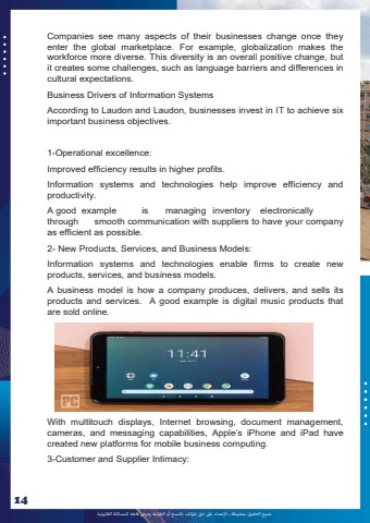%u062c%u0645%u064a%u0639 %u0627%u0644%u062d%u0642%u0648%u0642 %u0645%u062d%u0641%u0648%u0638%u0629 %u0640 %u0627%u0625%u0644%u0639%u062a%u062f%u0627%u0621 %u0639%u0649%u0644 %u062d%u0642 %u0627%u0645%u0644%u0624%u0644%u0641 %u0628%u0627%u0644%u0646%u0633%u062e %u0623%u0648 %u0627%u0644%u0637%u0628%u0627%u0639%u0629 %u064a%u0639%u0631%u0636 %u0641%u0627%u0639%u0644%u0647 %u0644%u0644%u0645%u0633%u0627%u0626%u0644%u0629 %u0627%u0644%u0642%u0627%u0646%u0648%u0646%u064a%u062914Companies see many aspects of their businesses change once they enter the global marketplace. For example, globalization makes the workforce more diverse. This diversity is an overall positive change, but it creates some challenges, such as language barriers and differences in cultural expectations. Business Drivers of Information Systems According to Laudon and Laudon, businesses invest in IT to achieve six important business objectives. 1-Operational excellence: Improved efficiency results in higher profits. Information systems and technologies help improve efficiency and productivity. A good example is managing inventory electronically through smooth communication with suppliers to have your company as efficient as possible. 2- New Products, Services, and Business Models: Information systems and technologies enable firms to create new products, services, and business models. A business model is how a company produces, delivers, and sells its products and services. A good example is digital music products that are sold online. With multitouch displays, Internet browsing, document management, cameras, and messaging capabilities, Apple%u2019s iPhone and iPad have created new platforms for mobile business computing. 3-Customer and Supplier Intimacy: