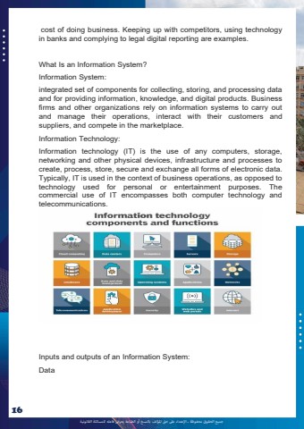%u062c%u0645%u064a%u0639 %u0627%u0644%u062d%u0642%u0648%u0642 %u0645%u062d%u0641%u0648%u0638%u0629 %u0640 %u0627%u0625%u0644%u0639%u062a%u062f%u0627%u0621 %u0639%u0649%u0644 %u062d%u0642 %u0627%u0645%u0644%u0624%u0644%u0641 %u0628%u0627%u0644%u0646%u0633%u062e %u0623%u0648 %u0627%u0644%u0637%u0628%u0627%u0639%u0629 %u064a%u0639%u0631%u0636 %u0641%u0627%u0639%u0644%u0647 %u0644%u0644%u0645%u0633%u0627%u0626%u0644%u0629 %u0627%u0644%u0642%u0627%u0646%u0648%u0646%u064a%u062916cost of doing business. Keeping up with competitors, using technology in banks and complying to legal digital reporting are examples. What Is an Information System? Information System: integrated set of components for collecting, storing, and processing data and for providing information, knowledge, and digital products. Business firms and other organizations rely on information systems to carry out and manage their operations, interact with their customers and suppliers, and compete in the marketplace. Information Technology: Information technology (IT) is the use of any computers, storage, networking and other physical devices, infrastructure and processes to create, process, store, secure and exchange all forms of electronic data. Typically, IT is used in the context of business operations, as opposed to technology used for personal or entertainment purposes. The commercial use of IT encompasses both computer technology and telecommunications. Inputs and outputs of an Information System: Data