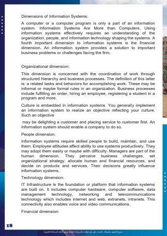 %u062c%u0645%u064a%u0639 %u0627%u0644%u062d%u0642%u0648%u0642 %u0645%u062d%u0641%u0648%u0638%u0629 %u0640 %u0627%u0625%u0644%u0639%u062a%u062f%u0627%u0621 %u0639%u0649%u0644 %u062d%u0642 %u0627%u0645%u0644%u0624%u0644%u0641 %u0628%u0627%u0644%u0646%u0633%u062e %u0623%u0648 %u0627%u0644%u0637%u0628%u0627%u0639%u0629 %u064a%u0639%u0631%u0636 %u0641%u0627%u0639%u0644%u0647 %u0644%u0644%u0645%u0633%u0627%u0626%u0644%u0629 %u0627%u0644%u0642%u0627%u0646%u0648%u0646%u064a%u062918Dimensions of Information Systems: A computer or a computer program is only a part of an information system. Information Systems Are More than Computers. Using information systems effectively requires an understanding of the organization, people, and information technology shaping the systems. A fourth important dimension to information systems is the financial dimension. An information system provides a solution to important business problems or challenges facing the firm. Organizational dimension: This dimension is concerned with the coordination of work through structured hierarchy and business processes. The definition of this latter is: a related tasks and behaviors for accomplishing work. These may be informal or maybe formal rules in an organization. Business processes include fulfilling an order, hiring an employee, registering a student in a program and more. Culture is embedded in information systems. You generally implement an information system to realize an objective reflecting your culture. Such an objective may be delighting a customer and placing service to customer first. An information system should enable a company to do so. People dimension: Information systems require skilled people to build, maintain, and use them. Employee attitudes affect ability to use systems productively. They may adopt them easily or maybe with difficulty. Managers are part of the human dimension. They perceive business challenges, set organizational strategy, allocate human and financial resources, and decide on products and services. Their decisions greatly influence information systems. Technology dimension: IT Infrastructure is the foundation or platform that information systems are built on. It includes computer hardware, computer software, data management technology, networking and telecommunications technology which includes internet and web, extranets, intranets. This connectivity also enables voice and video communications. Financial dimension: