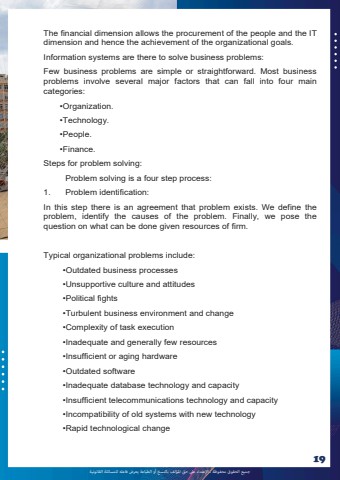 %u062c%u0645%u064a%u0639 %u0627%u0644%u062d%u0642%u0648%u0642 %u0645%u062d%u0641%u0648%u0638%u0629 %u0640 %u0627%u0625%u0644%u0639%u062a%u062f%u0627%u0621 %u0639%u0649%u0644 %u062d%u0642 %u0627%u0645%u0644%u0624%u0644%u0641 %u0628%u0627%u0644%u0646%u0633%u062e %u0623%u0648 %u0627%u0644%u0637%u0628%u0627%u0639%u0629 %u064a%u0639%u0631%u0636 %u0641%u0627%u0639%u0644%u0647 %u0644%u0644%u0645%u0633%u0627%u0626%u0644%u0629 %u0627%u0644%u0642%u0627%u0646%u0648%u0646%u064a%u062919The financial dimension allows the procurement of the people and the IT dimension and hence the achievement of the organizational goals. Information systems are there to solve business problems: Few business problems are simple or straightforward. Most business problems involve several major factors that can fall into four main categories: %u2022Organization. %u2022Technology. %u2022People. %u2022Finance. Steps for problem solving: Problem solving is a four step process: 1. Problem identification: In this step there is an agreement that problem exists. We define the problem, identify the causes of the problem. Finally, we pose the question on what can be done given resources of firm. Typical organizational problems include: %u2022Outdated business processes %u2022Unsupportive culture and attitudes %u2022Political fights %u2022Turbulent business environment and change %u2022Complexity of task execution %u2022Inadequate and generally few resources %u2022Insufficient or aging hardware %u2022Outdated software %u2022Inadequate database technology and capacity %u2022Insufficient telecommunications technology and capacity %u2022Incompatibility of old systems with new technology %u2022Rapid technological change