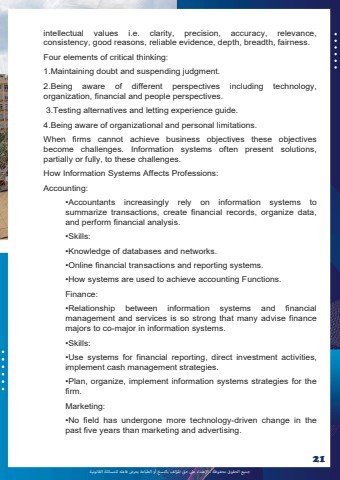 %u062c%u0645%u064a%u0639 %u0627%u0644%u062d%u0642%u0648%u0642 %u0645%u062d%u0641%u0648%u0638%u0629 %u0640 %u0627%u0625%u0644%u0639%u062a%u062f%u0627%u0621 %u0639%u0649%u0644 %u062d%u0642 %u0627%u0645%u0644%u0624%u0644%u0641 %u0628%u0627%u0644%u0646%u0633%u062e %u0623%u0648 %u0627%u0644%u0637%u0628%u0627%u0639%u0629 %u064a%u0639%u0631%u0636 %u0641%u0627%u0639%u0644%u0647 %u0644%u0644%u0645%u0633%u0627%u0626%u0644%u0629 %u0627%u0644%u0642%u0627%u0646%u0648%u0646%u064a%u062921intellectual values i.e. clarity, precision, accuracy, relevance, consistency, good reasons, reliable evidence, depth, breadth, fairness. Four elements of critical thinking: 1.Maintaining doubt and suspending judgment. 2.Being aware of different perspectives including technology, organization, financial and people perspectives. 3.Testing alternatives and letting experience guide. 4.Being aware of organizational and personal limitations. When firms cannot achieve business objectives these objectives become challenges. Information systems often present solutions, partially or fully, to these challenges. How Information Systems Affects Professions: Accounting: %u2022Accountants increasingly rely on information systems to summarize transactions, create financial records, organize data, and perform financial analysis. %u2022Skills: %u2022Knowledge of databases and networks. %u2022Online financial transactions and reporting systems. %u2022How systems are used to achieve accounting Functions. Finance: %u2022Relationship between information systems and financial management and services is so strong that many advise finance majors to co-major in information systems. %u2022Skills: %u2022Use systems for financial reporting, direct investment activities, implement cash management strategies. %u2022Plan, organize, implement information systems strategies for the firm. Marketing: %u2022No field has undergone more technology-driven change in the past five years than marketing and advertising.