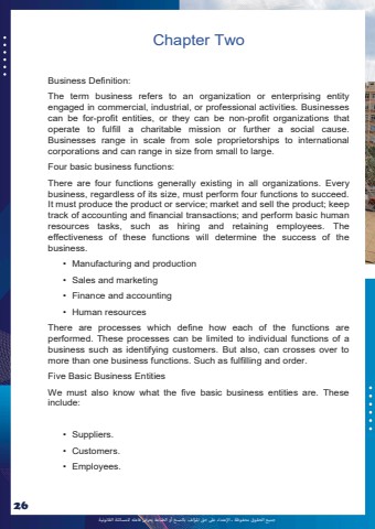 %u062c%u0645%u064a%u0639 %u0627%u0644%u062d%u0642%u0648%u0642 %u0645%u062d%u0641%u0648%u0638%u0629 %u0640 %u0627%u0625%u0644%u0639%u062a%u062f%u0627%u0621 %u0639%u0649%u0644 %u062d%u0642 %u0627%u0645%u0644%u0624%u0644%u0641 %u0628%u0627%u0644%u0646%u0633%u062e %u0623%u0648 %u0627%u0644%u0637%u0628%u0627%u0639%u0629 %u064a%u0639%u0631%u0636 %u0641%u0627%u0639%u0644%u0647 %u0644%u0644%u0645%u0633%u0627%u0626%u0644%u0629 %u0627%u0644%u0642%u0627%u0646%u0648%u0646%u064a%u062926Chapter TwoBusiness Definition: The term business refers to an organization or enterprising entity engaged in commercial, industrial, or professional activities. Businesses can be for-profit entities, or they can be non-profit organizations that operate to fulfill a charitable mission or further a social cause. Businesses range in scale from sole proprietorships to international corporations and can range in size from small to large. Four basic business functions: There are four functions generally existing in all organizations. Every business, regardless of its size, must perform four functions to succeed. It must produce the product or service; market and sell the product; keep track of accounting and financial transactions; and perform basic human resources tasks, such as hiring and retaining employees. The effectiveness of these functions will determine the success of the business. %u2022 Manufacturing and production %u2022 Sales and marketing %u2022 Finance and accounting %u2022 Human resources There are processes which define how each of the functions are performed. These processes can be limited to individual functions of a business such as identifying customers. But also, can crosses over to more than one business functions. Such as fulfilling and order. Five Basic Business Entities We must also know what the five basic business entities are. These include: %u2022 Suppliers. %u2022 Customers. %u2022 Employees.