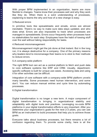 %u062c%u0645%u064a%u0639 %u0627%u0644%u062d%u0642%u0648%u0642 %u0645%u062d%u0641%u0648%u0638%u0629 %u0640 %u0627%u0625%u0644%u0639%u062a%u062f%u0627%u0621 %u0639%u0649%u0644 %u062d%u0642 %u0627%u0645%u0644%u0624%u0644%u0641 %u0628%u0627%u0644%u0646%u0633%u062e %u0623%u0648 %u0627%u0644%u0637%u0628%u0627%u0639%u0629 %u064a%u0639%u0631%u0636 %u0641%u0627%u0639%u0644%u0647 %u0644%u0644%u0645%u0633%u0627%u0626%u0644%u0629 %u0627%u0644%u0642%u0627%u0646%u0648%u0646%u064a%u062928With proper BPM implemented in an organization, teams are more flexible to changes. Teams know their processes well and why they work like they do. When there is a solid understanding of processes, explaining to teams the why and how of a new change is easy. 3.Reduced errors In primitive tools like spreadsheets and emails, errors are almost inevitable. There%u2019s no way to make sure data stays updated, and who does what. Errors are also impossible to track when processes are managed in spreadsheets. Errors occur frequently when processes have no stakeholders for each step. Employees have the habit of tossing stuff over the wall without taking responsibility for tasks. 4.Reduced micromanagement Micromanagement might get the job done at that instant. But in the long run, it is always destructive for a company. One of the primary reasons why leaders tend to micromanage their teams is to stick to their methods to reduce errors. 5.A company-wide platform The right BPM tool can act as a central platform to fetch and push data to core software systems like ERP and CRM. Usually, departmentspecific software is built for unique use cases. Accessing data and using it for other activities can be difficult. Integration of core software with a company-wide BPM platform unveils many benefits. Some processes need human intervention, and some don%u2019t. You can reduce manual entries and cycle time by automating processes. 6.Digital transformation Digital transformation is no longer a new term. A major component of digital transformation is bringing in organizational stability and adaptability with digital tools and practices. Leveraging no-code BPM platforms in your digital transformation efforts is very important. After you determine your organization%u2019s goals for the next 2-3 years, you can use BPM as an instrument to build processes that help you to achieve those goals. Everyone talks about business processes, but there remains a lot of confusion regarding them. To provide some clarity, here is all the