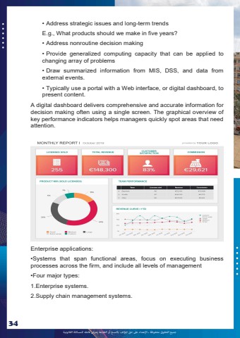 %u062c%u0645%u064a%u0639 %u0627%u0644%u062d%u0642%u0648%u0642 %u0645%u062d%u0641%u0648%u0638%u0629 %u0640 %u0627%u0625%u0644%u0639%u062a%u062f%u0627%u0621 %u0639%u0649%u0644 %u062d%u0642 %u0627%u0645%u0644%u0624%u0644%u0641 %u0628%u0627%u0644%u0646%u0633%u062e %u0623%u0648 %u0627%u0644%u0637%u0628%u0627%u0639%u0629 %u064a%u0639%u0631%u0636 %u0641%u0627%u0639%u0644%u0647 %u0644%u0644%u0645%u0633%u0627%u0626%u0644%u0629 %u0627%u0644%u0642%u0627%u0646%u0648%u0646%u064a%u062934%u2022 Address strategic issues and long-term trends E.g., What products should we make in five years? %u2022 Address nonroutine decision making %u2022 Provide generalized computing capacity that can be applied to changing array of problems %u2022 Draw summarized information from MIS, DSS, and data from external events. %u2022 Typically use a portal with a Web interface, or digital dashboard, to present content. A digital dashboard delivers comprehensive and accurate information for decision making often using a single screen. The graphical overview of key performance indicators helps managers quickly spot areas that need attention. Enterprise applications: %u2022Systems that span functional areas, focus on executing business processes across the firm, and include all levels of management %u2022Four major types: 1.Enterprise systems. 2.Supply chain management systems.