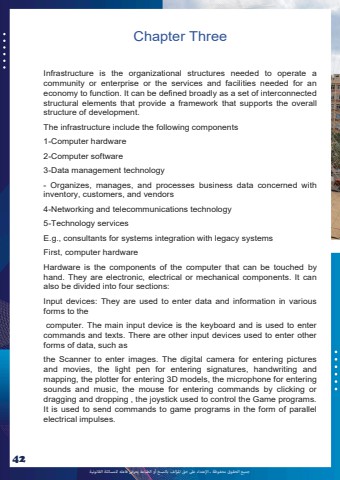 %u062c%u0645%u064a%u0639 %u0627%u0644%u062d%u0642%u0648%u0642 %u0645%u062d%u0641%u0648%u0638%u0629 %u0640 %u0627%u0625%u0644%u0639%u062a%u062f%u0627%u0621 %u0639%u0649%u0644 %u062d%u0642 %u0627%u0645%u0644%u0624%u0644%u0641 %u0628%u0627%u0644%u0646%u0633%u062e %u0623%u0648 %u0627%u0644%u0637%u0628%u0627%u0639%u0629 %u064a%u0639%u0631%u0636 %u0641%u0627%u0639%u0644%u0647 %u0644%u0644%u0645%u0633%u0627%u0626%u0644%u0629 %u0627%u0644%u0642%u0627%u0646%u0648%u0646%u064a%u062942Chapter ThreeInfrastructure is the organizational structures needed to operate a community or enterprise or the services and facilities needed for an economy to function. It can be defined broadly as a set of interconnected structural elements that provide a framework that supports the overall structure of development. The infrastructure include the following components 1-Computer hardware 2-Computer software 3-Data management technology - Organizes, manages, and processes business data concerned with inventory, customers, and vendors 4-Networking and telecommunications technology 5-Technology services E.g., consultants for systems integration with legacy systems First, computer hardware Hardware is the components of the computer that can be touched by hand. They are electronic, electrical or mechanical components. It can also be divided into four sections: Input devices: They are used to enter data and information in various forms to the computer. The main input device is the keyboard and is used to enter commands and texts. There are other input devices used to enter other forms of data, such as the Scanner to enter images. The digital camera for entering pictures and movies, the light pen for entering signatures, handwriting and mapping, the plotter for entering 3D models, the microphone for entering sounds and music, the mouse for entering commands by clicking or dragging and dropping , the joystick used to control the Game programs. It is used to send commands to game programs in the form of parallel electrical impulses.