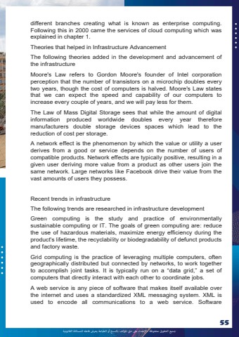 %u062c%u0645%u064a%u0639 %u0627%u0644%u062d%u0642%u0648%u0642 %u0645%u062d%u0641%u0648%u0638%u0629 %u0640 %u0627%u0625%u0644%u0639%u062a%u062f%u0627%u0621 %u0639%u0649%u0644 %u062d%u0642 %u0627%u0645%u0644%u0624%u0644%u0641 %u0628%u0627%u0644%u0646%u0633%u062e %u0623%u0648 %u0627%u0644%u0637%u0628%u0627%u0639%u0629 %u064a%u0639%u0631%u0636 %u0641%u0627%u0639%u0644%u0647 %u0644%u0644%u0645%u0633%u0627%u0626%u0644%u0629 %u0627%u0644%u0642%u0627%u0646%u0648%u0646%u064a%u062955different branches creating what is known as enterprise computing. Following this in 2000 came the services of cloud computing which was explained in chapter 1. Theories that helped in Infrastructure Advancement The following theories added in the development and advancement of the infrastructure Moore's Law refers to Gordon Moore's founder of Intel corporation perception that the number of transistors on a microchip doubles every two years, though the cost of computers is halved. Moore's Law states that we can expect the speed and capability of our computers to increase every couple of years, and we will pay less for them. The Law of Mass Digital Storage sees that while the amount of digital information produced worldwide doubles every year therefore manufacturers double storage devices spaces which lead to the reduction of cost per storage. A network effect is the phenomenon by which the value or utility a user derives from a good or service depends on the number of users of compatible products. Network effects are typically positive, resulting in a given user deriving more value from a product as other users join the same network. Large networks like Facebook drive their value from the vast amounts of users they possess. Recent trends in infrastructure The following trends are researched in infrastructure development Green computing is the study and practice of environmentally sustainable computing or IT. The goals of green computing are: reduce the use of hazardous materials, maximize energy efficiency during the product's lifetime, the recyclability or biodegradability of defunct products and factory waste. Grid computing is the practice of leveraging multiple computers, often geographically distributed but connected by networks, to work together to accomplish joint tasks. It is typically run on a %u201cdata grid,%u201d a set of computers that directly interact with each other to coordinate jobs. A web service is any piece of software that makes itself available over the internet and uses a standardized XML messaging system. XML is used to encode all communications to a web service. Software