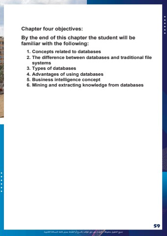 %u062c%u0645%u064a%u0639 %u0627%u0644%u062d%u0642%u0648%u0642 %u0645%u062d%u0641%u0648%u0638%u0629 %u0640 %u0627%u0625%u0644%u0639%u062a%u062f%u0627%u0621 %u0639%u0649%u0644 %u062d%u0642 %u0627%u0645%u0644%u0624%u0644%u0641 %u0628%u0627%u0644%u0646%u0633%u062e %u0623%u0648 %u0627%u0644%u0637%u0628%u0627%u0639%u0629 %u064a%u0639%u0631%u0636 %u0641%u0627%u0639%u0644%u0647 %u0644%u0644%u0645%u0633%u0627%u0626%u0644%u0629 %u0627%u0644%u0642%u0627%u0646%u0648%u0646%u064a%u062959Chapter four objectives:By the end of this chapter the student will be familiar with the following:1. Concepts related to databases 2. The difference between databases and traditional file systems 3. Types of databases 4. Advantages of using databases 5. Business intelligence concept 6. Mining and extracting knowledge from databases
