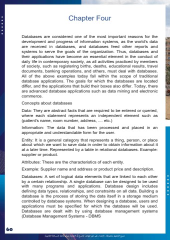 %u062c%u0645%u064a%u0639 %u0627%u0644%u062d%u0642%u0648%u0642 %u0645%u062d%u0641%u0648%u0638%u0629 %u0640 %u0627%u0625%u0644%u0639%u062a%u062f%u0627%u0621 %u0639%u0649%u0644 %u062d%u0642 %u0627%u0645%u0644%u0624%u0644%u0641 %u0628%u0627%u0644%u0646%u0633%u062e %u0623%u0648 %u0627%u0644%u0637%u0628%u0627%u0639%u0629 %u064a%u0639%u0631%u0636 %u0641%u0627%u0639%u0644%u0647 %u0644%u0644%u0645%u0633%u0627%u0626%u0644%u0629 %u0627%u0644%u0642%u0627%u0646%u0648%u0646%u064a%u062960Chapter FourDatabases are considered one of the most important reasons for the development and progress of information systems, as the world's data are received in databases, and databases feed other reports and systems to serve the goals of the organization. Thus, databases and their applications have become an essential element in the conduct of daily life in contemporary society, as all activities practiced by members of society, such as registering births, deaths, educational results, travel documents, banking operations, and others, must deal with databases. All of the above examples today fall within the scope of traditional database applications. The goals for which the databases are located differ, and the applications that build their boxes also differ. Today, there are advanced database applications such as data mining and electronic commerce. Concepts about databases Data: They are abstract facts that are required to be entered or queried, where each statement represents an independent element such as (patient's name, room number, address, .... etc.) Information: The data that has been processed and placed in an appropriate and understandable form for the user. Entity: It is a general category that represents a thing, person, or place about which we want to save data in order to obtain information about it at a later time. Represented by a table in relational databases. Example: supplier or product. Attributes: These are the characteristics of each entity. Example: Supplier name and address or product price and description. Databases: A set of logical data elements that are linked to each other by a certain relationship. A single database can be designed to be used with many programs and applications. Database design includes defining data types, relationships, and constraints on all data. Building a database is the process of storing the data itself in a storage medium controlled by database systems. When designing a database, users and applications must be specified for which the database will be used. Databases are dealt with by using database management systems (Database Management Systems - DBMS