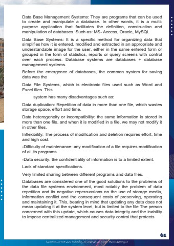 %u062c%u0645%u064a%u0639 %u0627%u0644%u062d%u0642%u0648%u0642 %u0645%u062d%u0641%u0648%u0638%u0629 %u0640 %u0627%u0625%u0644%u0639%u062a%u062f%u0627%u0621 %u0639%u0649%u0644 %u062d%u0642 %u0627%u0645%u0644%u0624%u0644%u0641 %u0628%u0627%u0644%u0646%u0633%u062e %u0623%u0648 %u0627%u0644%u0637%u0628%u0627%u0639%u0629 %u064a%u0639%u0631%u0636 %u0641%u0627%u0639%u0644%u0647 %u0644%u0644%u0645%u0633%u0627%u0626%u0644%u0629 %u0627%u0644%u0642%u0627%u0646%u0648%u0646%u064a%u062961Data Base Management Systems: They are programs that can be used to create and manipulate a database. In other words, it is a multipurpose application that facilitates the definition, construction and manipulation of databases. Such as: MS- Access, Oracle, MySQL Data Base Systems: It is a specific method for organizing data that simplifies how it is entered, modified and extracted in an appropriate andunderstandable image for the user, either in the same entered form or grouped in the form of statistics, reports or query screens with control over each process. Database systems are databases + database management systems. Before the emergence of databases, the common system for saving data was the Data File Systems, which is electronic files used such as Word and Excel files. This system has many disadvantages such as: Data duplication: Repetition of data in more than one file, which wastes storage space, effort and time. Data heterogeneity or incompatibility: the same information is stored in more than one file, and when it is modified in a file, we may not modify it in other files. Inflexibility: The process of modification and deletion requires effort, time and high cost. -Difficulty of maintenance: any modification of a file requires modification of all its programs. -Data security: the confidentiality of information is to a limited extent. Lack of standard specifications. Very limited sharing between different programs and data files. Databases are considered one of the good solutions to the problems of the data file systems environment, most notably the problem of data repetition and its negative repercussions on the use of storage media, information conflict and the consequent costs of preserving, operating and maintaining it. This, bearing in mind that updating any data does not mean updating it at the system level, but is limited to the file The person concerned with this update, which causes data integrity and the inability to impose centralized management and security control that protects
