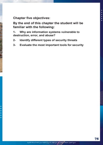 %u062c%u0645%u064a%u0639 %u0627%u0644%u062d%u0642%u0648%u0642 %u0645%u062d%u0641%u0648%u0638%u0629 %u0640 %u0627%u0625%u0644%u0639%u062a%u062f%u0627%u0621 %u0639%u0649%u0644 %u062d%u0642 %u0627%u0645%u0644%u0624%u0644%u0641 %u0628%u0627%u0644%u0646%u0633%u062e %u0623%u0648 %u0627%u0644%u0637%u0628%u0627%u0639%u0629 %u064a%u0639%u0631%u0636 %u0641%u0627%u0639%u0644%u0647 %u0644%u0644%u0645%u0633%u0627%u0626%u0644%u0629 %u0627%u0644%u0642%u0627%u0646%u0648%u0646%u064a%u062975Chapter five objectives:By the end of this chapter the student will be familiar with the following: 1- Why are information systems vulnerable to destruction, error, and abuse? 2- Identify different types of security threats 3- Evaluate the most important tools for security