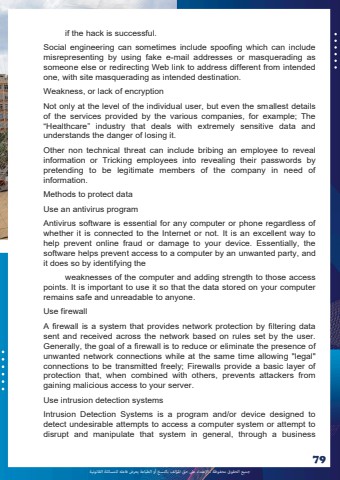 %u062c%u0645%u064a%u0639 %u0627%u0644%u062d%u0642%u0648%u0642 %u0645%u062d%u0641%u0648%u0638%u0629 %u0640 %u0627%u0625%u0644%u0639%u062a%u062f%u0627%u0621 %u0639%u0649%u0644 %u062d%u0642 %u0627%u0645%u0644%u0624%u0644%u0641 %u0628%u0627%u0644%u0646%u0633%u062e %u0623%u0648 %u0627%u0644%u0637%u0628%u0627%u0639%u0629 %u064a%u0639%u0631%u0636 %u0641%u0627%u0639%u0644%u0647 %u0644%u0644%u0645%u0633%u0627%u0626%u0644%u0629 %u0627%u0644%u0642%u0627%u0646%u0648%u0646%u064a%u062979if the hack is successful. Social engineering can sometimes include spoofing which can include misrepresenting by using fake e-mail addresses or masquerading as someone else or redirecting Web link to address different from intended one, with site masquerading as intended destination. Weakness, or lack of encryption Not only at the level of the individual user, but even the smallest details of the services provided by the various companies, for example; The %u201cHealthcare%u201d industry that deals with extremely sensitive data and understands the danger of losing it. Other non technical threat can include bribing an employee to reveal information or Tricking employees into revealing their passwords by pretending to be legitimate members of the company in need of information. Methods to protect data Use an antivirus program Antivirus software is essential for any computer or phone regardless of whether it is connected to the Internet or not. It is an excellent way to help prevent online fraud or damage to your device. Essentially, the software helps prevent access to a computer by an unwanted party, and it does so by identifying the weaknesses of the computer and adding strength to those access points. It is important to use it so that the data stored on your computer remains safe and unreadable to anyone. Use firewall A firewall is a system that provides network protection by filtering data sent and received across the network based on rules set by the user. Generally, the goal of a firewall is to reduce or eliminate the presence of unwanted network connections while at the same time allowing \connections to be transmitted freely; Firewalls provide a basic layer of protection that, when combined with others, prevents attackers from gaining malicious access to your server. Use intrusion detection systems Intrusion Detection Systems is a program and/or device designed to detect undesirable attempts to access a computer system or attempt to disrupt and manipulate that system in general, through a business