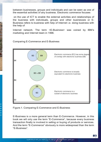 %u062c%u0645%u064a%u0639 %u0627%u0644%u062d%u0642%u0648%u0642 %u0645%u062d%u0641%u0648%u0638%u0629 %u0640 %u0627%u0625%u0644%u0639%u062a%u062f%u0627%u0621 %u0639%u0649%u0644 %u062d%u0642 %u0627%u0645%u0644%u0624%u0644%u0641 %u0628%u0627%u0644%u0646%u0633%u062e %u0623%u0648 %u0627%u0644%u0637%u0628%u0627%u0639%u0629 %u064a%u0639%u0631%u0636 %u0641%u0627%u0639%u0644%u0647 %u0644%u0644%u0645%u0633%u0627%u0626%u0644%u0629 %u0627%u0644%u0642%u0627%u0646%u0648%u0646%u064a%u062987between businesses, groups and individuals and can be seen as one of the essential activities of any business. Electronic commerce focuses on the use of ICT to enable the external activities and relationships of the business with individuals, groups and other businesses or EBusiness refers to business with help of Internet i.e. doing business with the help of Internet network. The term was coined by IBM%u2019s marketing and Internet team in 1996. Comparing E-Commerce and E-Business Figure.1. Comparing E-Commerce and E-Business E-Business is a more general term than E-Commerce. However, in this book we will only use the term %u201cE-Commerce%u201c, because every business transaction finally is involved in selling or buying of products or services. And the term %u201cE-Commerce%u201d obviously is more widespread than the term %u201cE-Business%u201d.