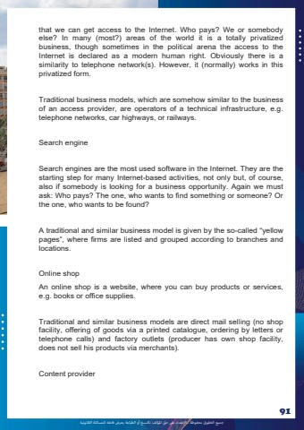 %u062c%u0645%u064a%u0639 %u0627%u0644%u062d%u0642%u0648%u0642 %u0645%u062d%u0641%u0648%u0638%u0629 %u0640 %u0627%u0625%u0644%u0639%u062a%u062f%u0627%u0621 %u0639%u0649%u0644 %u062d%u0642 %u0627%u0645%u0644%u0624%u0644%u0641 %u0628%u0627%u0644%u0646%u0633%u062e %u0623%u0648 %u0627%u0644%u0637%u0628%u0627%u0639%u0629 %u064a%u0639%u0631%u0636 %u0641%u0627%u0639%u0644%u0647 %u0644%u0644%u0645%u0633%u0627%u0626%u0644%u0629 %u0627%u0644%u0642%u0627%u0646%u0648%u0646%u064a%u062991that we can get access to the Internet. Who pays? We or somebody else? In many (most?) areas of the world it is a totally privatized business, though sometimes in the political arena the access to the Internet is declared as a modern human right. Obviously there is a similarity to telephone network(s). However, it (normally) works in this privatized form. Traditional business models, which are somehow similar to the business of an access provider, are operators of a technical infrastructure, e.g. telephone networks, car highways, or railways. Search engine Search engines are the most used software in the Internet. They are the starting step for many Internet-based activities, not only but, of course, also if somebody is looking for a business opportunity. Again we must ask: Who pays? The one, who wants to find something or someone? Or the one, who wants to be found? A traditional and similar business model is given by the so-called %u201cyellow pages%u201d, where firms are listed and grouped according to branches and locations. Online shop An online shop is a website, where you can buy products or services, e.g. books or office supplies. Traditional and similar business models are direct mail selling (no shop facility, offering of goods via a printed catalogue, ordering by letters or telephone calls) and factory outlets (producer has own shop facility, does not sell his products via merchants). Content provider