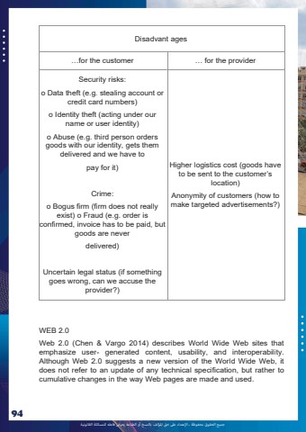 %u062c%u0645%u064a%u0639 %u0627%u0644%u062d%u0642%u0648%u0642 %u0645%u062d%u0641%u0648%u0638%u0629 %u0640 %u0627%u0625%u0644%u0639%u062a%u062f%u0627%u0621 %u0639%u0649%u0644 %u062d%u0642 %u0627%u0645%u0644%u0624%u0644%u0641 %u0628%u0627%u0644%u0646%u0633%u062e %u0623%u0648 %u0627%u0644%u0637%u0628%u0627%u0639%u0629 %u064a%u0639%u0631%u0636 %u0641%u0627%u0639%u0644%u0647 %u0644%u0644%u0645%u0633%u0627%u0626%u0644%u0629 %u0627%u0644%u0642%u0627%u0646%u0648%u0646%u064a%u062994Disadvant ages%u2026for the customer %u2026 for the providerSecurity risks:%u043e Data theft (e.g. stealing account or credit card numbers)%u043e Identity theft (acting under our name or user identity)%u043e Abuse (e.g. third person orders goods with our identity, gets them delivered and we have topay for it)Crime:%u043e Bogus firm (firm does not really exist) %u043e Fraud (e.g. order is confirmed, invoice has to be paid, but goods are neverdelivered)Uncertain legal status (if something goes wrong, can we accuse the provider?)Higher logistics cost (goods have to be sent to the customer%u2019s location)Anonymity of customers (how to make targeted advertisements?)WEB 2.0 Web 2.0 (Chen & Vargo 2014) describes World Wide Web sites that emphasize user- generated content, usability, and interoperability. Although Web 2.0 suggests a new version of the World Wide Web, it does not refer to an update of any technical specification, but rather to cumulative changes in the way Web pages are made and used.