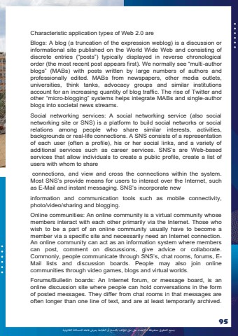 %u062c%u0645%u064a%u0639 %u0627%u0644%u062d%u0642%u0648%u0642 %u0645%u062d%u0641%u0648%u0638%u0629 %u0640 %u0627%u0625%u0644%u0639%u062a%u062f%u0627%u0621 %u0639%u0649%u0644 %u062d%u0642 %u0627%u0645%u0644%u0624%u0644%u0641 %u0628%u0627%u0644%u0646%u0633%u062e %u0623%u0648 %u0627%u0644%u0637%u0628%u0627%u0639%u0629 %u064a%u0639%u0631%u0636 %u0641%u0627%u0639%u0644%u0647 %u0644%u0644%u0645%u0633%u0627%u0626%u0644%u0629 %u0627%u0644%u0642%u0627%u0646%u0648%u0646%u064a%u062995Characteristic application types of Web 2.0 are Blogs: A blog (a truncation of the expression weblog) is a discussion or informational site published on the World Wide Web and consisting of discrete entries (%u201cposts%u201d) typically displayed in reverse chronological order (the most recent post appears first). We normally see %u201cmulti-author blogs%u201d (MABs) with posts written by large numbers of authors and professionally edited. MABs from newspapers, other media outlets, universities, think tanks, advocacy groups and similar institutions account for an increasing quantity of blog traffic. The rise of Twitter and other %u201cmicro-blogging%u201d systems helps integrate MABs and single-author blogs into societal news streams. Social networking services: A social networking service (also social networking site or SNS) is a platform to build social networks or social relations among people who share similar interests, activities, backgrounds or real-life connections. A SNS consists of a representation of each user (often a profile), his or her social links, and a variety of additional services such as career services. SNS%u2019s are Web-based services that allow individuals to create a public profile, create a list of users with whom to share connections, and view and cross the connections within the system. Most SNS%u2019s provide means for users to interact over the Internet, such as E-Mail and instant messaging. SNS%u2019s incorporate new information and communication tools such as mobile connectivity, photo/video/sharing and blogging. Online communities: An online community is a virtual community whose members interact with each other primarily via the Internet. Those who wish to be a part of an online community usually have to become a member via a specific site and necessarily need an Internet connection. An online community can act as an information system where members can post, comment on discussions, give advice or collaborate. Commonly, people communicate through SNS%u2019s, chat rooms, forums, EMail lists and discussion boards. People may also join online communities through video games, blogs and virtual worlds. Forums/Bulletin boards: An Internet forum, or message board, is an online discussion site where people can hold conversations in the form of posted messages. They differ from chat rooms in that messages are often longer than one line of text, and are at least temporarily archived.