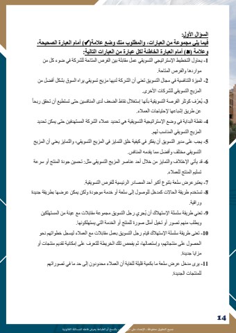 %u062c%u0645%u064a%u0639 %u0627%u0644%u062d%u0642%u0648%u0642 %u0645%u062d%u0641%u0648%u0638%u0629 %u0640 %u0627%u0625%u0644%u0639%u062a%u062f%u0627%u0621 %u0639%u0649%u0644 %u062d%u0642 %u0627%u0645%u0644%u0624%u0644%u0641 %u0628%u0627%u0644%u0646%u0633%u062e %u0623%u0648 %u0627%u0644%u0637%u0628%u0627%u0639%u0629 %u064a%u0639%u0631%u0636 %u0641%u0627%u0639%u0644%u0647 %u0644%u0644%u0645%u0633%u0627%u0626%u0644%u0629 %u0627%u0644%u0642%u0627%u0646%u0648%u0646%u064a%u06291413%u0627%u0644%u0633%u0624%u0627%u0644 %u0627%u0623%u0644%u0648%u0644: %u0641%u064a%u0645%u0627 %u064a%u0644%u064a %u0645%u062c%u0645%u0648%u0639%u0629 %u0645%u0646 %u0627%u0644%u0639%u0628%u0627%u0631%u0627%u062a%u060c %u0648%u0627%u0644%u0645%u0637%u0644%u0648%u0628 %u0645%u0646%u0643 %u0648%u0636%u0639 %u0639%u0627%u0644%u0645%u0629)%u2713( %u0623%u0645%u0627%u0645 %u0627%u0644%u0639%u0628%u0627%u0631%u0629 %u0627%u0644%u0635%u062d%u064a%u062d%u0629%u060c %u0648%u0639%u0627%u0644%u0645%u0629 )%uf0fb )%u0623%u0645%u0627%u0645 %u0627%u0644%u0639%u0628%u0627%u0631%u0629 %u0627%u0644%u062e%u0627%u0637%u0626%u0629 %u0644%u0643%u0644 %u0639%u0628%u0627%u0631%u0629 %u0645%u0646 %u0627%u0644%u0639%u0628%u0627%u0631%u0627%u062a %u0627%u0644%u062a%u0627%u0644%u064a%u0629: 1 -%u064a%u062d%u0627%u0648%u0644 %u0627%u0644%u062a%u062e%u0637%u064a%u0637 %u0627%u0625%u0644%u0633%u062a%u0631%u0627%u062a%u064a%u062c%u064a %u0627%u0644%u062a%u0633%u0648%u064a%u0642%u064a %u0639%u0645%u0644 %u0645%u0642%u0627%u0628%u0644%u0629 %u0628%u064a%u0646 %u0627%u0644%u0641%u0631%u0635 %u0627%u0644%u0645%u062a%u0627%u062d%u0629 %u0644%u0644%u0634%u0631%u0643%u0629 %u0641%u064a %u0636%u0648%u0621 %u0643%u0644 %u0645%u0646 %u0645%u0648%u0627%u0631%u062f%u0647%u0627 %u0648%u0627%u0644%u0641%u0631%u0635 %u0627%u0644%u0645%u062a%u0627%u062d%u0629. 2 -%u0627%u0644%u0645%u064a%u0632%u0629 %u0627%u0644%u062a%u0646%u0627%u0641%u0633%u064a%u0629 %u0641%u064a %u0645%u062c%u0627%u0644 %u0627%u0644%u062a%u0633%u0648%u064a%u0642 %u062a%u0639%u0646%u064a %u0623%u0646 %u0627%u0644%u0634%u0631%u0643%u0629 %u0644%u062f%u064a%u0647%u0627 %u0645%u0632%u064a%u062c %u062a%u0633%u0648%u064a%u0642%u064a %u064a%u0631%u0627%u0647 %u0627%u0644%u0633%u0648%u0642 %u0628%u0634%u0643%u0644 %u0623%u0641%u0636%u0644 %u0645%u0646 %u0627%u0644%u0645%u0632%u064a%u062c %u0627%u0644%u062a%u0633%u0648%u064a%u0642%u064a %u0644%u0644%u0634%u0631%u0643%u0627%u062a %u0627%u0623%u0644%u062e%u0631%u0649. %u064b%u064f%u0639%u0651%u0631%u0641 %u0643%u0648%u062a%u0644%u0631 %u0627%u0644%u0641%u0631%u0635%u0629 %u0627%u0644%u062a%u0633%u0648%u064a%u0642%u064a%u0629 %u0628%u0623%u0646%u0647%u0627 %u0625%u0633%u062a%u063a%u0627%u0644%u0644 %u0646%u0642%u0627%u0637 %u0627%u0644%u0636%u0639%u0641 %u0644%u062f%u0649 %u0627%u0644%u0645%u0646%u0627%u0641%u0633%u064a%u0646 %u062d%u062a%u0649 %u062a%u0633%u062a%u0637%u064a%u0639 %u0623%u0646 %u062a%u062d%u0642%u0642 %u0631%u0628%u062d%u06273 -%u064a%u0639%u0646 %u0637%u0631%u064a%u0642 %u0625%u0634%u0628%u0627%u0639%u0647%u0627 %u0625%u0644%u062d%u062a%u064a%u0627%u062c%u0627%u062a %u0627%u0644%u0639%u0645%u0627%u0644%u0621. 4 -%u0646%u0642%u0637%u0629 %u0627%u0644%u0628%u062f%u0627%u064a%u0629 %u0641%u064a %u0648%u0636%u0639 %u0627%u0625%u0644%u0633%u062a%u0631%u0627%u062a%u064a%u062c%u064a%u0629 %u0627%u0644%u062a%u0633%u0648%u064a%u0642%u064a%u0629 %u0647%u064a %u062a%u062d%u062f%u064a%u062f %u0639%u0645%u0627%u0644%u0621 %u0627%u0644%u0634%u0631%u0643%u0629 %u0627%u0644%u0645%u0633%u062a%u0647%u062f%u0641%u064a%u0646 %u062d%u062a%u0649 %u064a%u0645%u0643%u0646 %u062a%u062d%u062f%u064a%u062f %u0627%u0644%u0645%u0632%u064a%u062c %u0627%u0644%u062a%u0633%u0648%u064a%u0642%u064a %u0627%u0644%u0645%u0646%u0627%u0633%u0628 %u0644%u0647%u0645.5 -%u064a%u062c%u0628 %u0639%u0644%u0649 %u0645%u062f%u064a%u0631 %u0627%u0644%u062a%u0633%u0648%u064a%u0642 %u0623%u0646 %u064a%u0641%u0643%u0631 %u0641%u064a %u0643%u064a%u0641%u064a%u0629 %u062e%u0644%u0642 %u0627%u0644%u062a%u0645%u0627%u064a%u0632 %u0641%u064a %u0627%u0644%u0645%u0632%u064a%u062c %u0627%u0644%u062a%u0633%u0648%u064a%u0642%u064a%u060c %u0648%u0627%u0644%u062a%u0645%u0627%u064a%u0632 %u064a%u0639%u0646%u064a %u0623%u0646 %u0627%u0644%u0645%u0632%u064a%u062c %u0627%u0644%u062a%u0633%u0648%u064a%u0642%u064a %u0645%u062e%u062a%u0644%u0641 %u0648%u0623%u0641%u0636%u0644 %u0645%u0645%u0627 %u064a%u0642%u062f%u0645%u0647 %u0627%u0644%u0645%u0646%u0627%u0641%u0633. 6 -%u0642%u062f %u064a%u0623%u062a%u064a %u0627%u0625%u0644%u062e%u062a%u0627%u0644%u0641 %u0648%u0627%u0644%u062a%u0645%u0627%u064a%u0632 %u0645%u0646 %u062e%u0627%u0644%u0644 %u0623%u062d%u062f %u0639%u0646%u0627%u0635%u0631 %u0627%u0644%u0645%u0632%u064a%u062c %u0627%u0644%u062a%u0633%u0648%u064a%u0642%u064a %u0645%u062b%u0644: %u062a%u062d%u0633%u064a%u0646 %u062c%u0648%u062f%u0629 %u0627%u0644%u0645%u0646%u062a%u062c %u0623%u0648 %u0633%u0631%u0639%u0629 %u062a%u0633%u0644%u064a%u0645 %u0627%u0644%u0645%u0646%u062a%u062c %u0644%u0644%u0639%u0645%u0627%u0644%u0621.7 -%u064a%u0639%u062a%u0628%u0631%u0639%u0631%u0636 %u0633%u0644%u0639%u0629 %u0628%u062a%u0646%u0648%u0639 %u0623%u0643%u0628%u0631 %u0623%u062d%u062f %u0627%u0644%u0645%u0635%u0627%u062f%u0631 %u0627%u0644%u0631%u0626%u064a%u0633%u064a%u0629 %u0644%u0644%u0641%u0631%u0635 %u0627%u0644%u062a%u0633%u0648%u064a%u0642%u064a%u0629. 8 -%u062a%u0633%u062a%u062e%u062f%u0645 %u0637%u0631%u064a%u0642%u0629 %u0627%u0644%u062d%u0627%u0627%u0644%u062a %u0643%u0645%u062f%u062e%u0644 %u0644%u0644%u0648%u0635%u0648%u0644 %u0625%u0644%u0649 %u0633%u0644%u0639%u0629 %u0623%u0648 %u062e%u062f%u0645%u0629 %u0645%u0648%u062c%u0648%u062f%u0629 %u0648%u0644%u0643%u0646 %u064a%u0645%u0643%u0646 %u0639%u0631%u0636%u0647%u0627 %u0628%u0637%u0631%u064a%u0642%u0629 %u062c%u062f%u064a%u062f%u0629 %u0648%u0631%u0627%u0642%u064a%u0629. %u064f%u062c%u0650%u0631%u064a %u0631%u062c%u0644 %u0627%u0644%u062a%u0633%u0648%u064a%u0642 %u0645%u062c%u0645%u0648%u0639%u0629 %u0645%u0642%u0627%u0628%u0627%u0644%u062a %u0