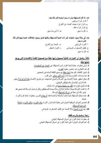 %u062c%u0645%u064a%u0639 %u0627%u0644%u062d%u0642%u0648%u0642 %u0645%u062d%u0641%u0648%u0638%u0629 %u0640 %u0627%u0625%u0644%u0639%u062a%u062f%u0627%u0621 %u0639%u0649%u0644 %u062d%u0642 %u0627%u0645%u0644%u0624%u0644%u0641 %u0628%u0627%u0644%u0646%u0633%u062e %u0623%u0648 %u0627%u0644%u0637%u0628%u0627%u0639%u0629 %u064a%u0639%u0631%u0636 %u0641%u0627%u0639%u0644%u0647 %u0644%u0644%u0645%u0633%u0627%u0626%u0644%u0629 %u0627%u0644%u0642%u0627%u0646%u0648%u0646%u064a%u06294441%u064f%u0639%u062f:13 -%u0625%u0630%u0627 %u0642%u0627%u0645 %u0627%u0644%u0645%u0633%u062a%u0647%u0644%u0643 %u0628%u0634%u0631%u0627%u0621 %u0633%u064a%u0627%u0631%u0629 %u062c%u062f%u064a%u062f%u0629 %u0641%u0625%u0646 %u0630%u0644%u0643 %u064a%u0623- %u0642%u0631%u0627%u0631 %u0634%u0631%u0627%u0621 %u0631%u0648%u062a%u064a%u0646%u0649. %u0628- %u0642%u0631%u0627%u0631 %u0634%u0631%u0627%u0621 %u0628%u0647%u062f%u0641 %u0627%u0644%u0628%u062d%u062b %u0639%u0646 %u0627%u0644%u062a%u0646%u0648%u0639. %u062c- %u0642%u0631%u0627%u0631 %u0634%u0631%u0627%u0621 %u0645%u0639%u0642%u062f . %u062f- %u0643%u0644 %u0645%u0627 %u0633%u0628%u0642. %u0647%u0640- %u0627%u0644 %u0634%u0626 %u0645%u0645%u0627 %u0633%u0628%u0642. 14 -%u0641%u0649 %u062d%u0627%u0644%u0629 %u0648%u062c%u0648%u062f %u0645%u0646%u062a%u062c%u0627%u062a %u063a%u064a%u0631 %u0630%u0627%u062a %u0623%u0647%u0645%u064a%u0629 %u0644%u0644%u0645%u0633%u062a%u0647%u0644%u0643 %u0648%u0644%u0643%u0646%u0647%u0627 %u062a%u062a%u0645%u064a%u0632 %u0628%u0648%u062c%u0648%u062f %u0625%u062e%u062a%u0627%u0644%u0641%u0627%u062a %u0639%u062f%u064a%u062f%u0629 %u0628%u064a%u0646%u0647%u0627 %u0641%u0625%u0646 %u0630%u0644%u0643 %u064f%u0639%u062f:%u0627%u0644%u0634%u0631%u0627%u0621 %u064a %u0623- %u0627%u0644%u0634%u0631%u0627%u0621 %u0627%u0644%u0631%u0648%u062a%u064a%u0646%u0649. %u0628 - %u0627%u0644%u0628%u062d%u062b %u0639%u0646 %u0627%u0644%u062a%u0646%u0648%u0639. %u062c- %u062a%u0642%u0644%u064a%u0644 %u0627%u0625%u0644 %u0636%u0637%u0631%u0627%u0628 %u0627%u0644%u0648%u062c%u062f%u0627%u0646%u0649. %u062f - %u0627%u0644%u0634%u0631%u0627%u0621 %u0627%u0644%u0645%u0639%u0642%u062f.%u0647%u0640- %u0643%u0644 %u0645%u0627 %u0633%u0628%u0642.%u064b: %u0648%u0636%u062d %u0623%u0649 %u0627%u0644%u0639%u0628%u0627%u0631%u0627%u062a %u0627%u0644%u062a%u0627%u0644%u064a%u0629 %u0635%u062d%u064a%u062d %u0648%u0623%u064a%u0647%u0627 %u062e%u0637%u0623 %u0645%u0639 %u062a%u0635%u062d%u064a%u062d %u0627%u0644%u0643%u0644%u0645%u0629 )%u0627%u0644%u0643%u0644%u0645%u0627%u062a( %u0627%u0644%u062a%u0649 %u064a%u0648%u062c%u062f %u062b%u0627%u0644%u062b%u0627%u062a%u062d%u062a%u0647%u0627 %u062e%u0637: 1 -%u0623%u0648%u0644%u0649 %u062e%u0637%u0648%u0627%u062a %u0639%u0645%u0644%u064a%u0629 %u0625%u062a%u062e%u0627%u0630 %u0627%u0644%u0642%u0631%u0627%u0631 %u0644%u062f%u0649 %u0627%u0644%u0645%u0633%u062a%u0647%u0644%u0643 %u0647%u0649 %u0627%u0644%u0628%u062d%u062b %u0639%u0646 %u0627%u0644%u0645%u0639%u0644%u0648%u0645%u0627%u062a . 2 -%u062a%u0639%u062f %u0627%u0644%u0634%u0643%u0627%u0648%u0649 %u0623%u062d%u062f %u0639%u0646%u0627%u0635%u0631 %u062e%u0637%u0648%u0629 %u0627%u0644%u0634%u0631%u0627%u0621.3 -%u062a%u062a%u0645%u064a%u0632 %u0627%u0644%u062b%u0642%u0627%u0641%u0627%u062a %u0627%u0644%u0641%u0631%u0639%u064a%u0629 %u0628%u0623%u0646%u0647%u0627 %u0645%u062a%u0641%u0642%u0629 %u0645%u0639 %u0646%u0633%u064a%u062c %u0627%u0644%u062b%u0642%u0627%u0641%u0629 %u0627%u0644%u0633%u0627%u0626%u062f%u0629 %u0641%u0649 %u0627%u0644%u0645%u062c%u062a%u0645%u0639. 4 -%u062a%u0639%u062f %u062c%u0645%u0627%u0639%u0627%u062a %u0627%u0644%u0637%u0645%u0648%u062d %u062c%u0645%u0627%u0639%u0627%u062a %u0630%u0627%u062a %u062a%u0623%u062b%u064a%u0631 %u0645%u0628%u0627%u0634%u0631 %u0639%u0644%u0649 %u0627%u0644%u0641%u0631%u062f. %u064b %u0648%u064a%u0642%u0648%u0645 5 -%u064a%u0645%u0643%u0646 %u062a%u062d%u0642%u064a%u0642 %u0639%u0645%u0644%u064a%u0629 %u0627%u0625%u0644 %u062a%u0635%u0627%u0644 %u0628%u064a%u0646 %u0627%u0644%u0634%u0631%u0643%u0629 %u0648%u0627%u0644%u0633%u0648%u0642 %u0627%u0644%u0645%u0633%u062a%u0647%u062f %u0641 %u0639%u0646 %u0637%u0631%u064a%u0642 %u0627%u0625%u0644%u062a%u0635%u0627%u0644 %u0628%u0642%u0627%u062f%u0629 %u0627%u0644%u0631%u0623%u0649 %u0623%u0648%u0627%u0644%u0642%u0627%u062f%u0629 %u0627%u0644%u0631%u0623%u0649 %u0628%u0627%u0625%u0644%u062a%u0635%u0627%u0644 %u0628%u0627%u0644%u0645%u0633%u062a%u0647%u0644%u0643%u064a%u0646 %u0627%u0644%u0646%u0647%u0627%u0626%u064a%u064a%u0646. %u064f%u0634%u0628%u0639 %u0645%u0646%u062a%u062c %u0648%u0627%u062d%u062f %u0623%u0643%u062b%u0631 %u0645%u0646 %u062d%u0627%u062c%u0629 %u0648%u0627%u062d%u062f%u0629 %u0641%u0649 %u0630%u0627%u062a %u0627%u0644%u0648%u0642%u062a.6 -%u0642%u062f %u064a7 -%u0625%u0630%u0627 %u0642%u0627%u0645%u062a %u0627%u0644%u0634%u0631%u0643%u0629 %u0628%u062d%u0645%u0644%u0629 %u0625%u0639%u0627%u0644%u0646%u064a%u0629 %u0625%u0644%u0628%u0627%u0644%u063a %u0631%u0633%u0627%u0644%u0629 %u0645%u062d%u062f%u062f%u0629 %u0644%u0644%u0645%u0633%u062a%u0647%u0644%u0643%u064a%u0646 %u0648%u0644%u0643%u0646 %u0644%u0645 %u062a%u0635%u0644 %u0627%u0644%u0631%u0633%u0627%u0644%u0629 %u0643%u0645%u0627 %u064a%u0646%u0628%u063a%u0649 %u0641%u0642%u062f %u064a%u0634%u064a%u0631 %u0630%u0644%u0643 %u0625%u0644%u0649 %u062e%u0637%u0623 %u0641%u0649 %u0625%u062f%u0631%u0627%u0643 %u0627%u0644%u0645%u0633%u062a%u0647%u0644%u0643 %u0644%u0644%u0631%u0633%u0627%u0644%u0629. %u064b %u0628%u0627%u0644%u0633%u0644%u0639%u0629 %u0623%u0648%u0627%u0644%u062e%u062f%u0645%u0629 %u0641%u0625%u0646%u0647 %u0627%u0644 %u064a%u062d%u062a%u0627%u062c %u0644%u0644%u0645%u0631%u0648%u0631 %u0628%u062e%u0637%u0648%u0627%u062a %u0625%u062a%u062e%u0627%u0630 %u0642%u0631%u0627%u0631%u0627%u0644%u0634%u0631%u0627%u0621 %u064b %u062e%u0627%u0635%u06278 -%u0639%u0646%u062f%u0645%u0627 %u064a%u062a%u0639%u0644%u0645 %u0627%u0644%u0645%u0633%u062a%u0647%u0644%u0643 %u0634%u064a%u0626%u0627%u0643%u0627